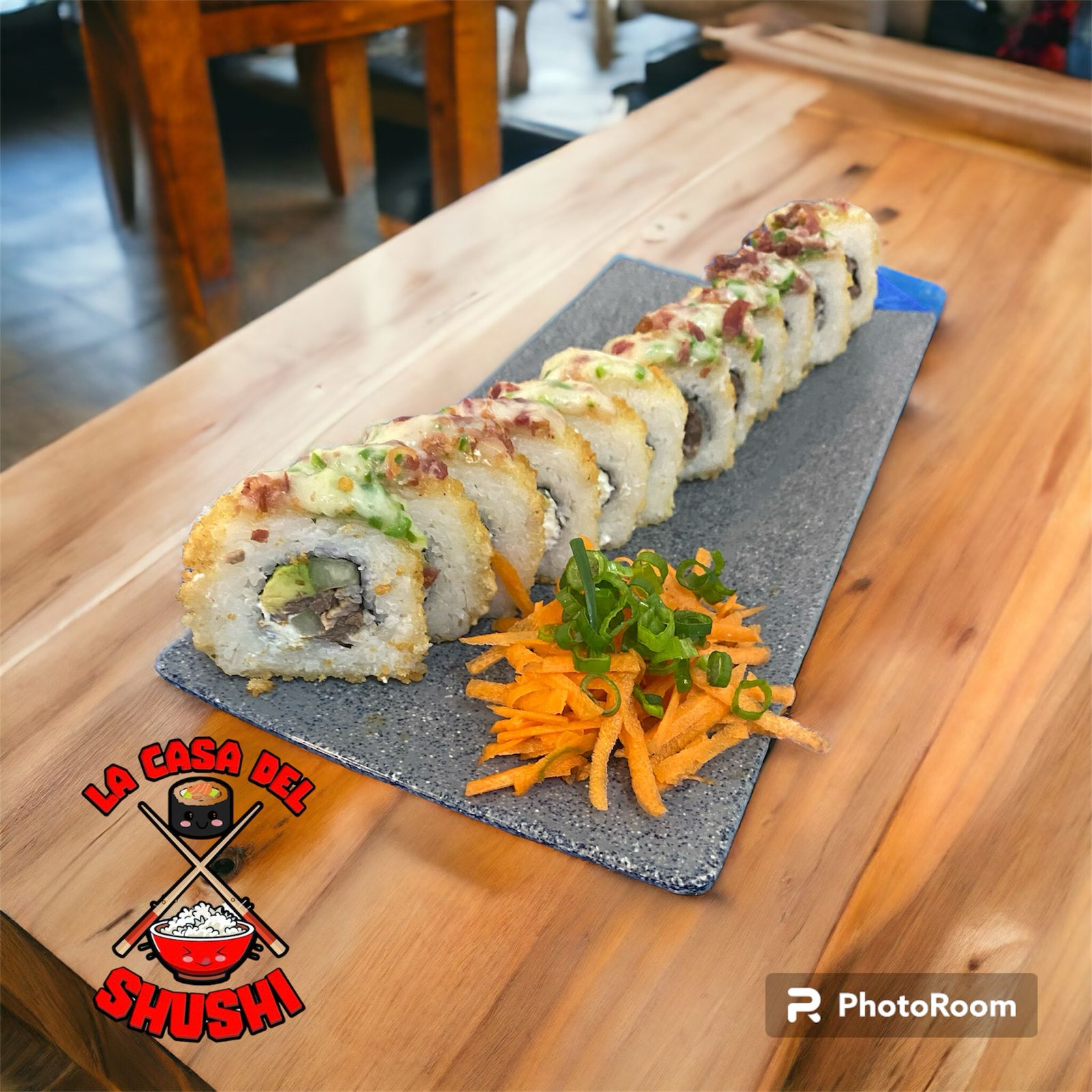 Filadelfia, aguacate, pepino, pollo y tocino, forrado de chile güerito frito con toping de tampico