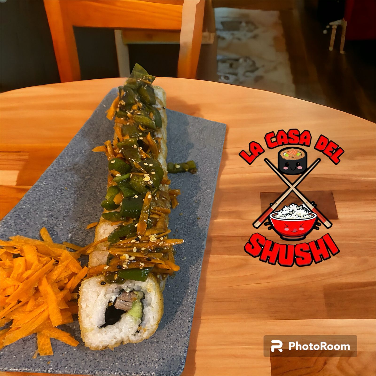 Philadelphia, aguacate, pepino, carne de res, con toping de chiles toreados