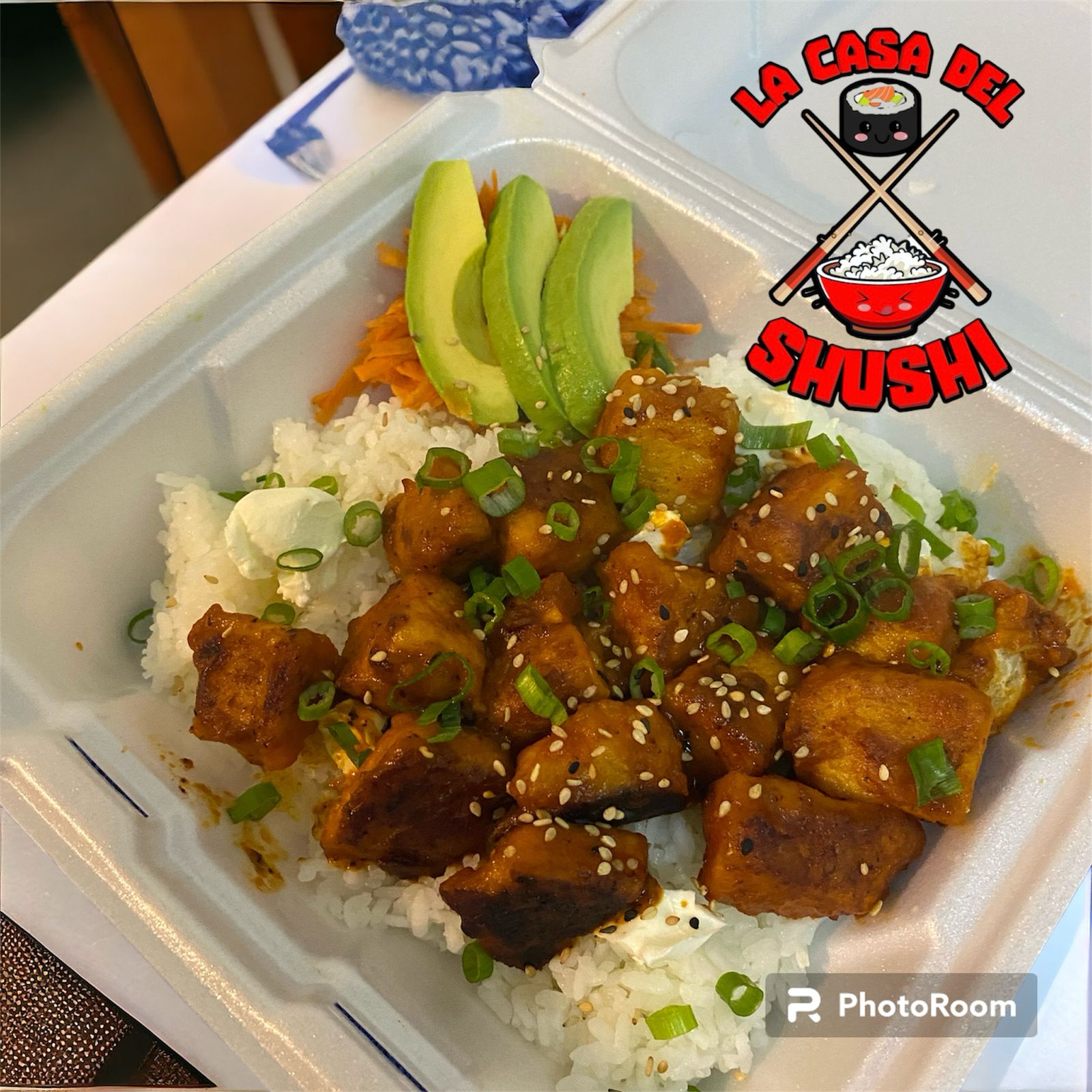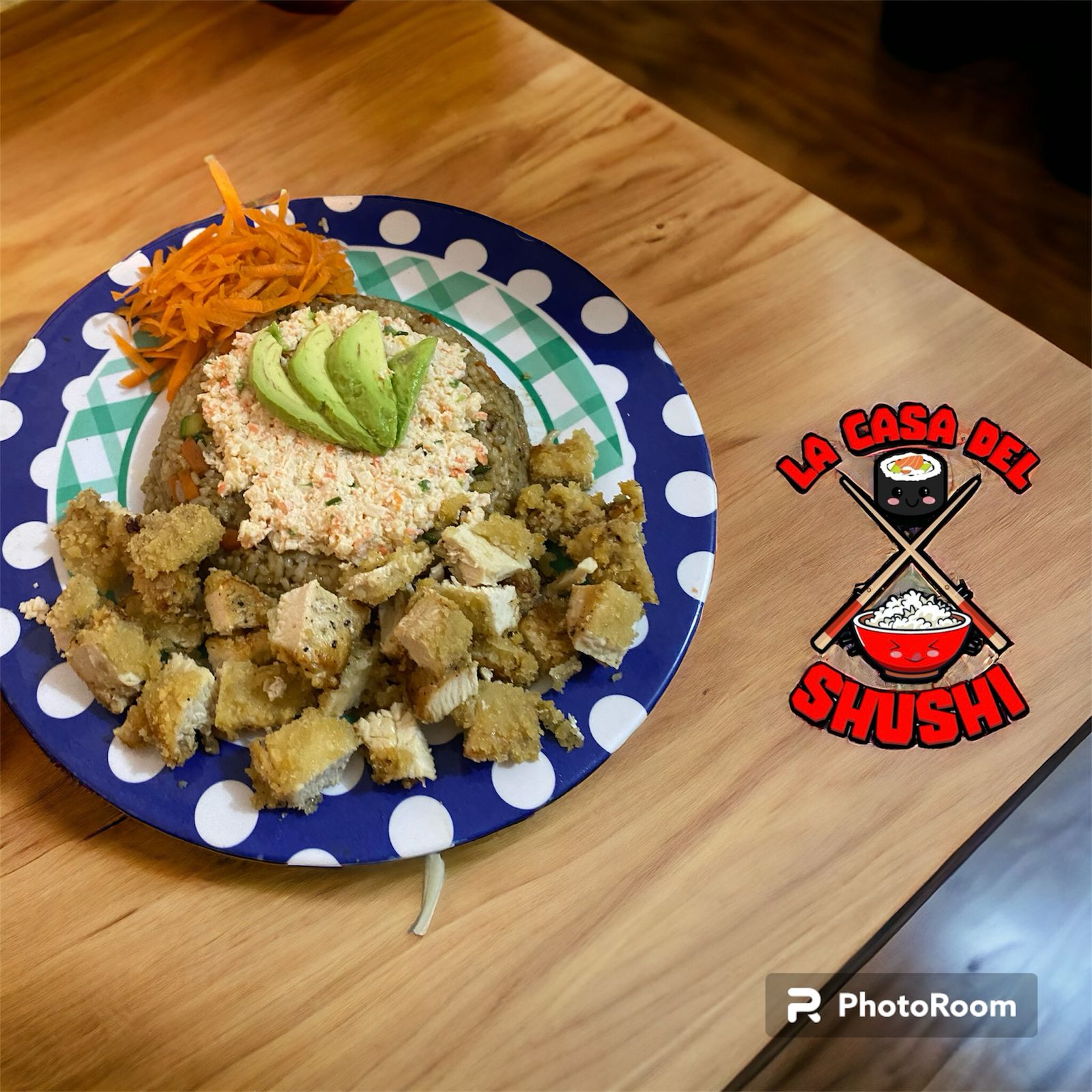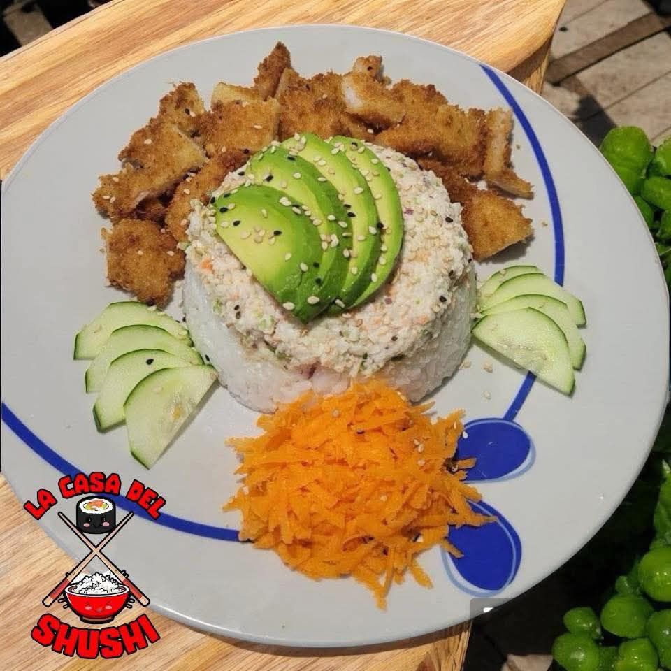 Arroz blanco con Tampico, aguacate, Philadelphia, zanahoria y proteína de su eleccion