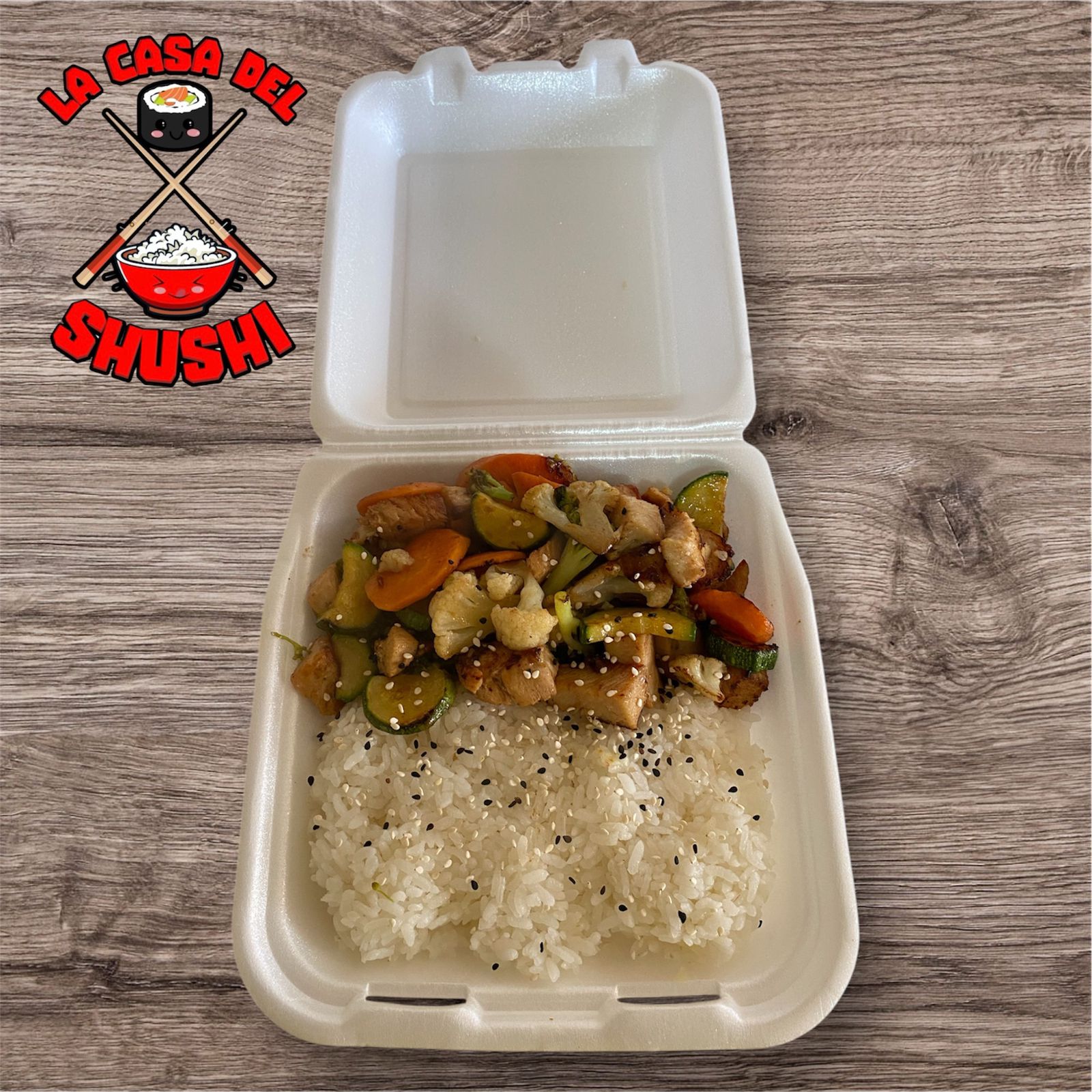Verduras mixtas salteadas a la plancha con proteína de su elección, montado sobre arroz blanco