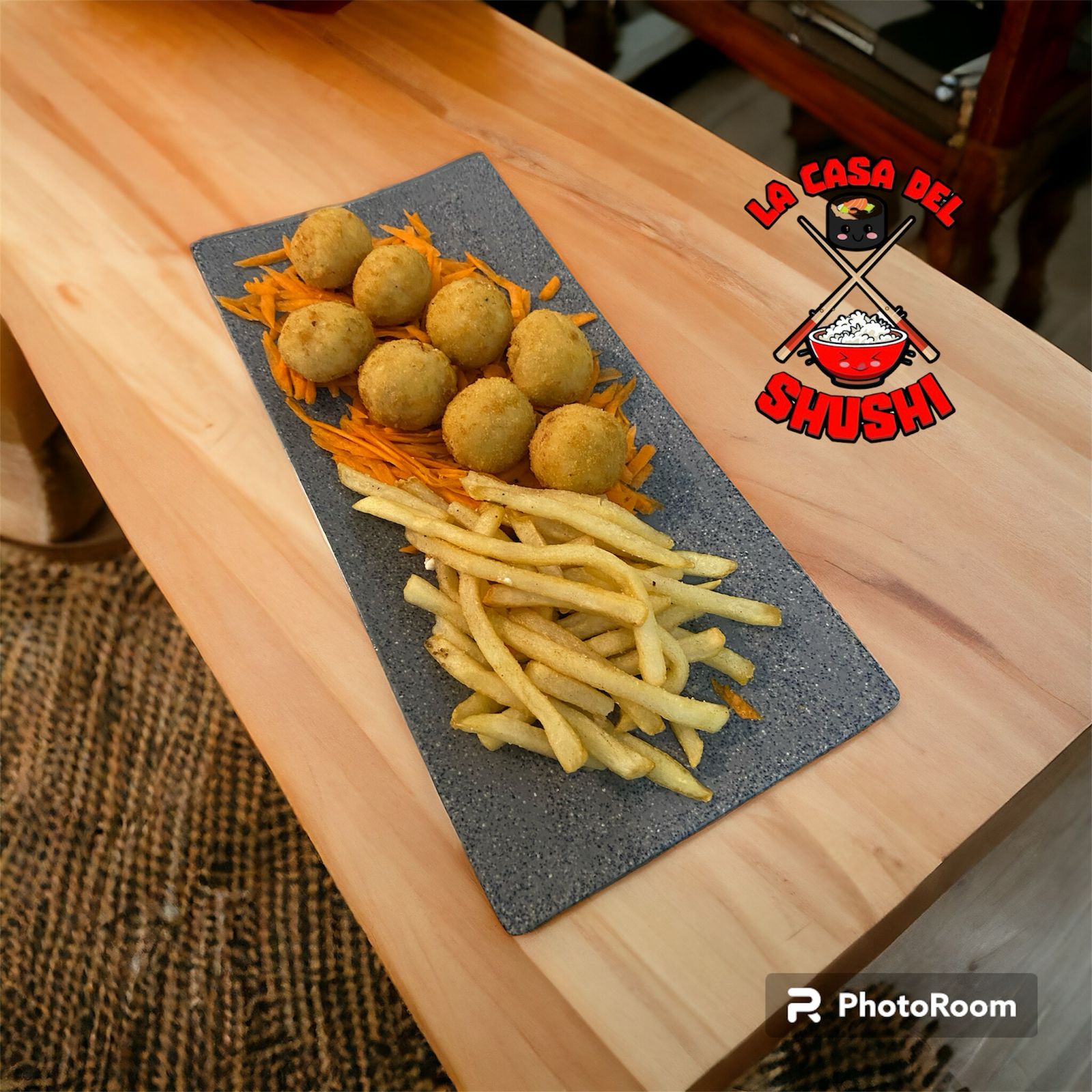 Bolitas de pollo con queso crema empanizaras acompañadas con papas fritas.