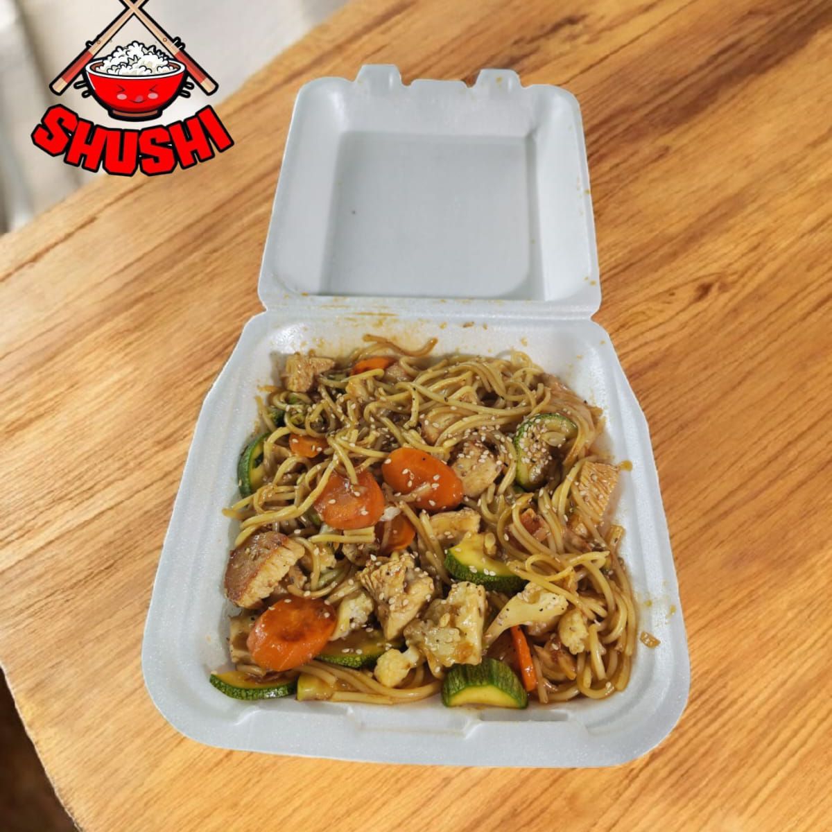 Fideos salteados con verduras mixtas y proteína de eleccion salseados con salsa yakisoba
