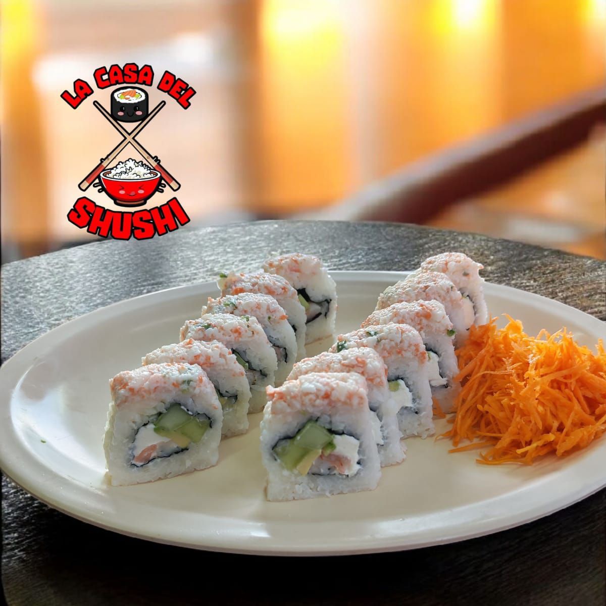 Phila, aguacate, pepino, camarón empanizado con toping de kanicama