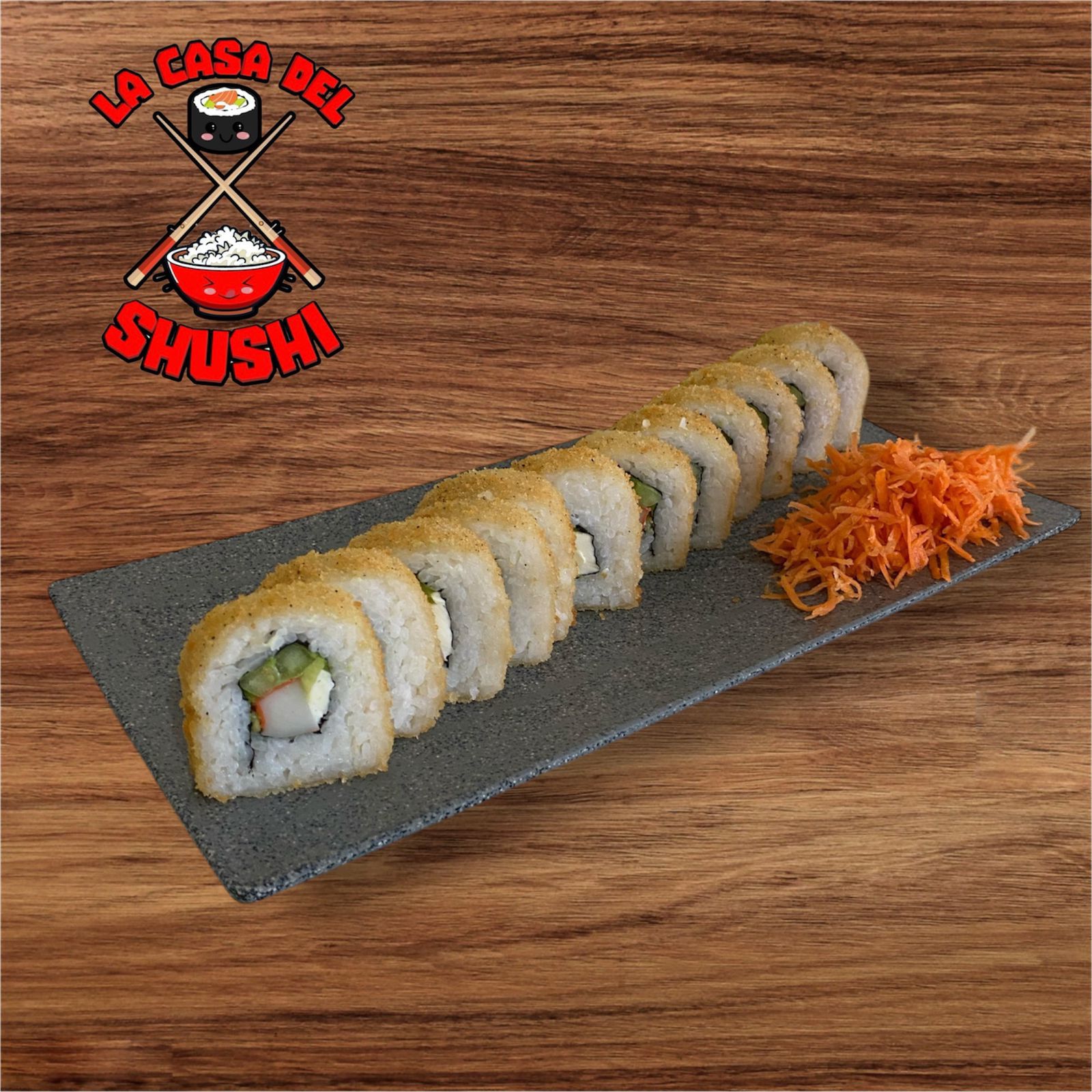 Philadelphia, aguacate, pepino, surimi empanizado, gratinado con queso Jack