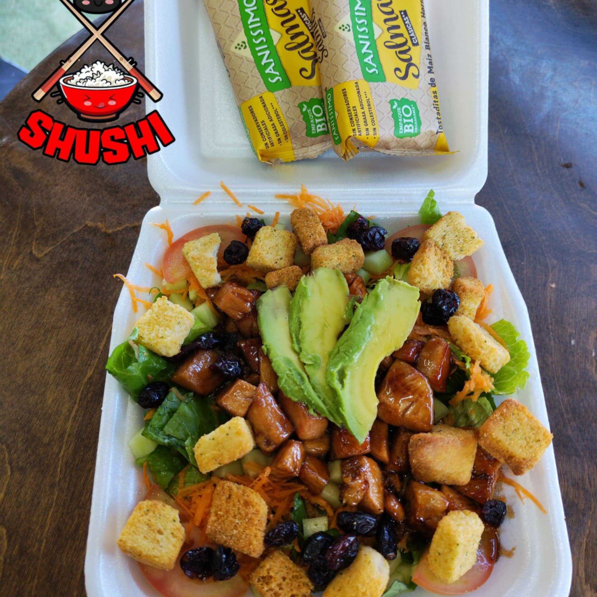 Ensalada, toping de arroz blanco y camarones empanizados, bañado con aderezo spicy