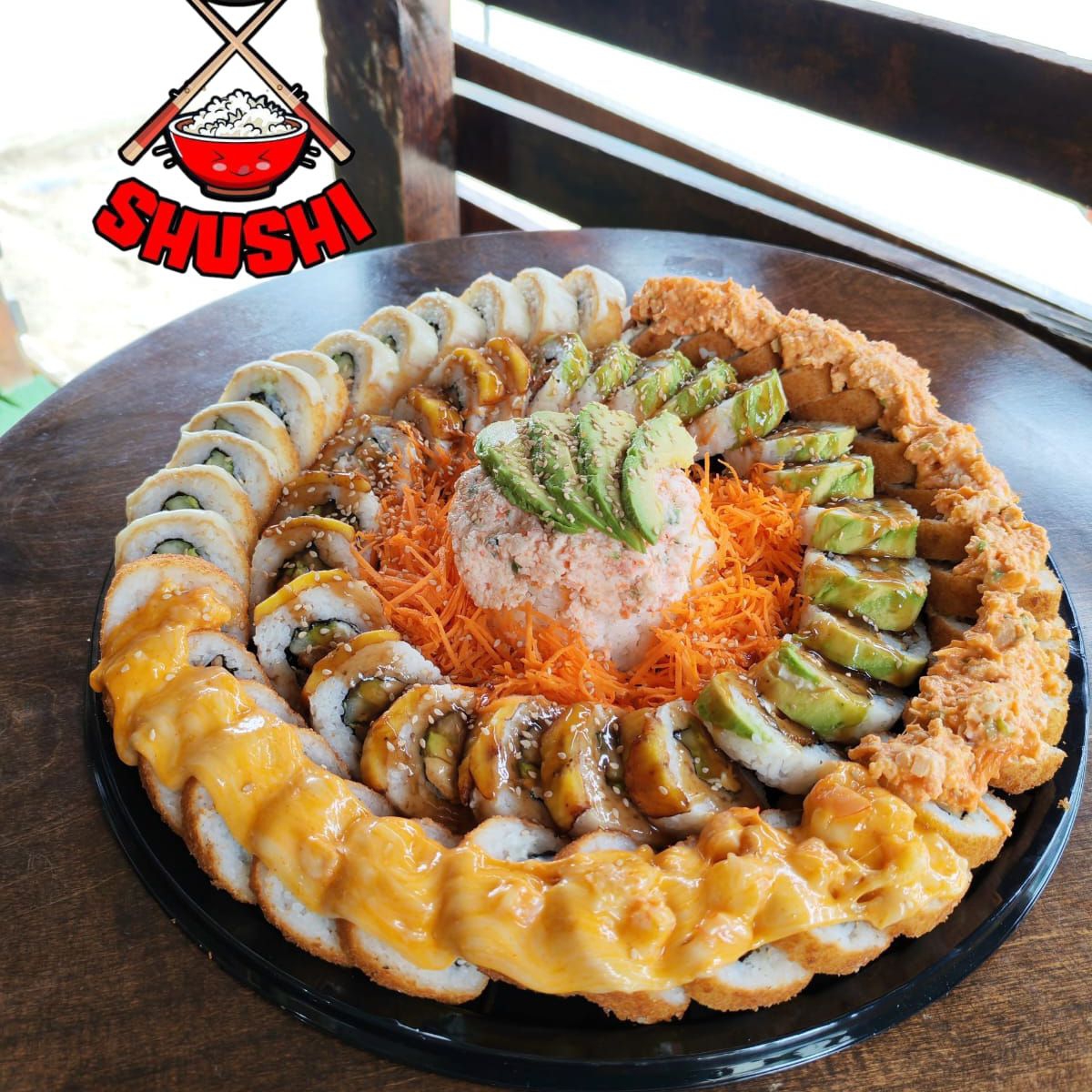 Charola de 5 rollos a elegir del menu (3 naturales 2 empanizados) acompañada de toping de arroz, Tampico, rodajas de aguacate y zanahoria