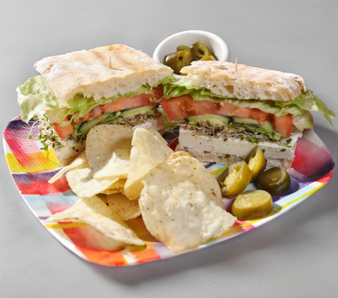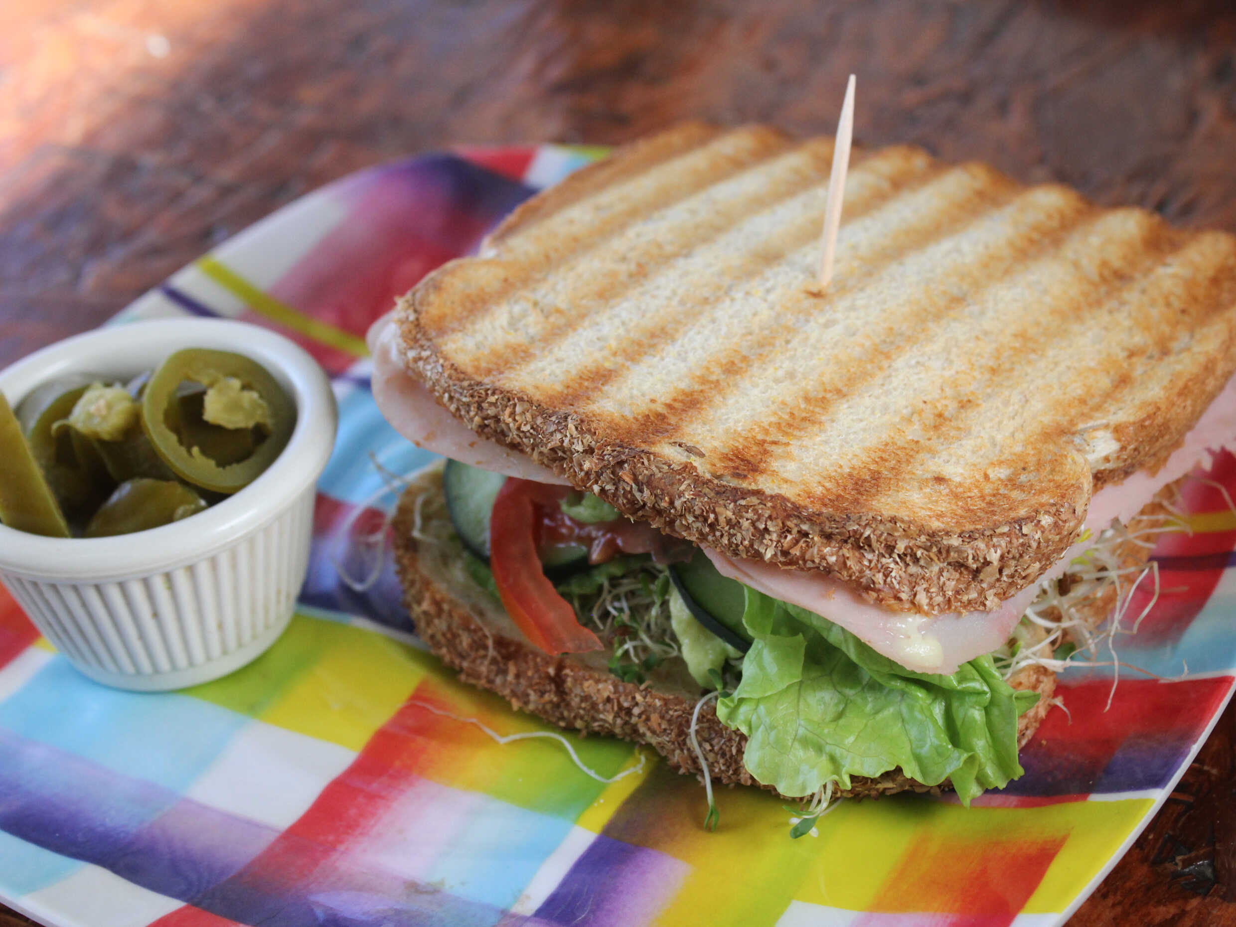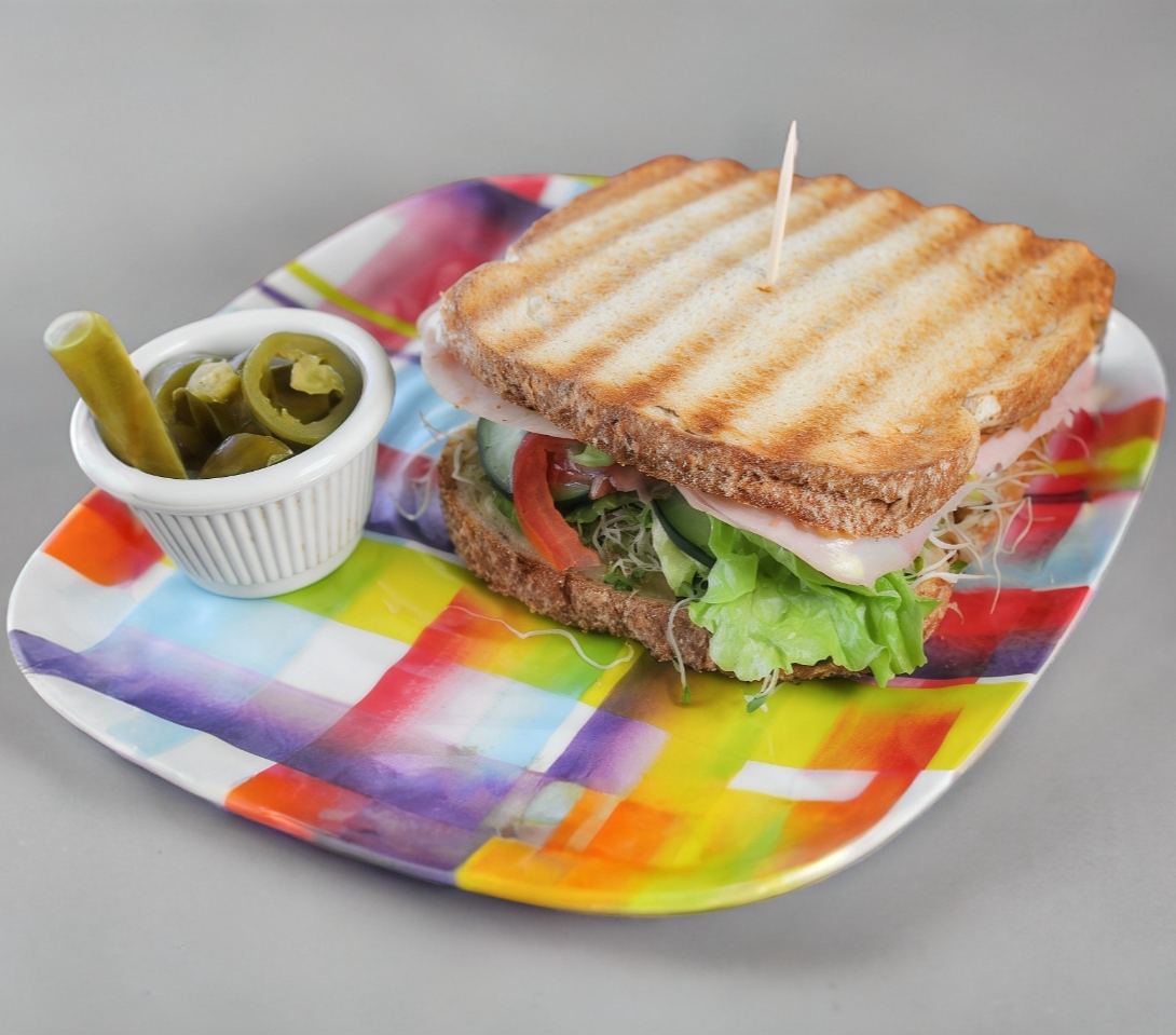 Jamón de pavo, queso suizo, lechuga, aguacate, pepino, tomate y alfalfa, a la plancha.