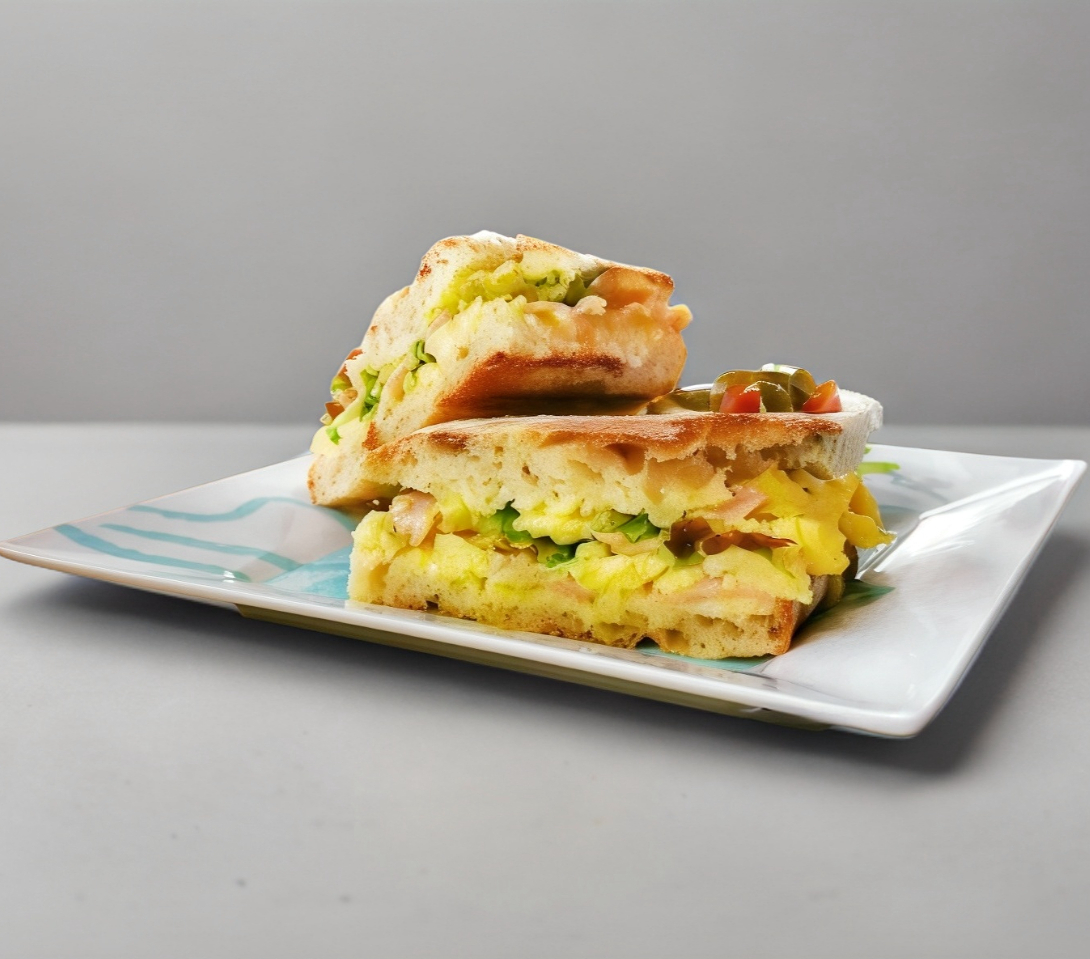 Huevo, jamón o tocino, queso suizo y aguacate, a la plancha.