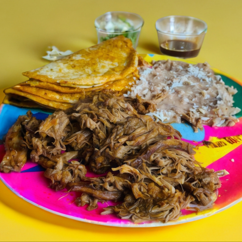 Queso cotija, crema, cebolla morada y cilantro, acompañados de frijoles.