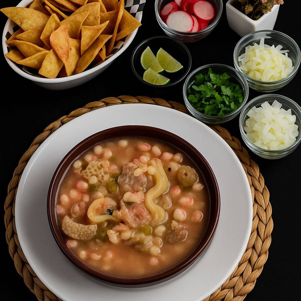 Delicioso Pozole Rojo con cilantro, cebolla, repollo, limones, rabanos y salsa acompañados de totopos.