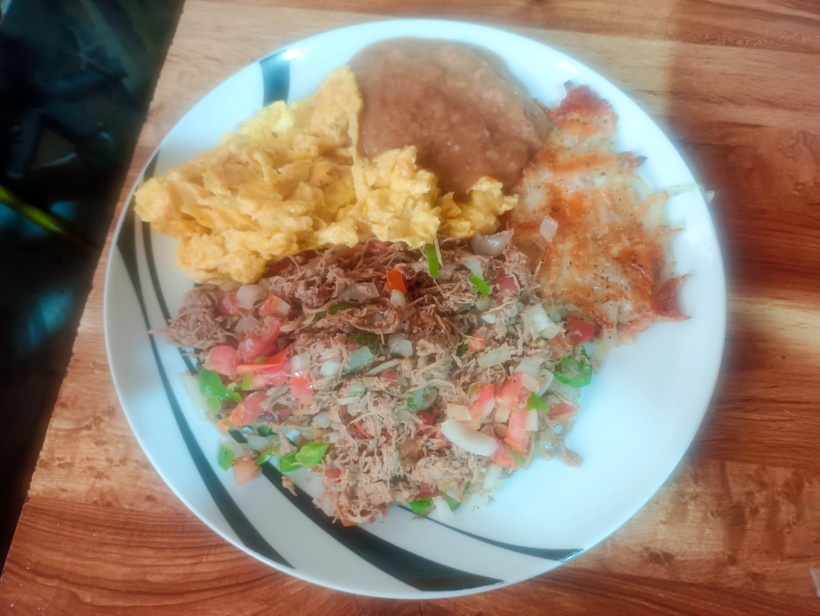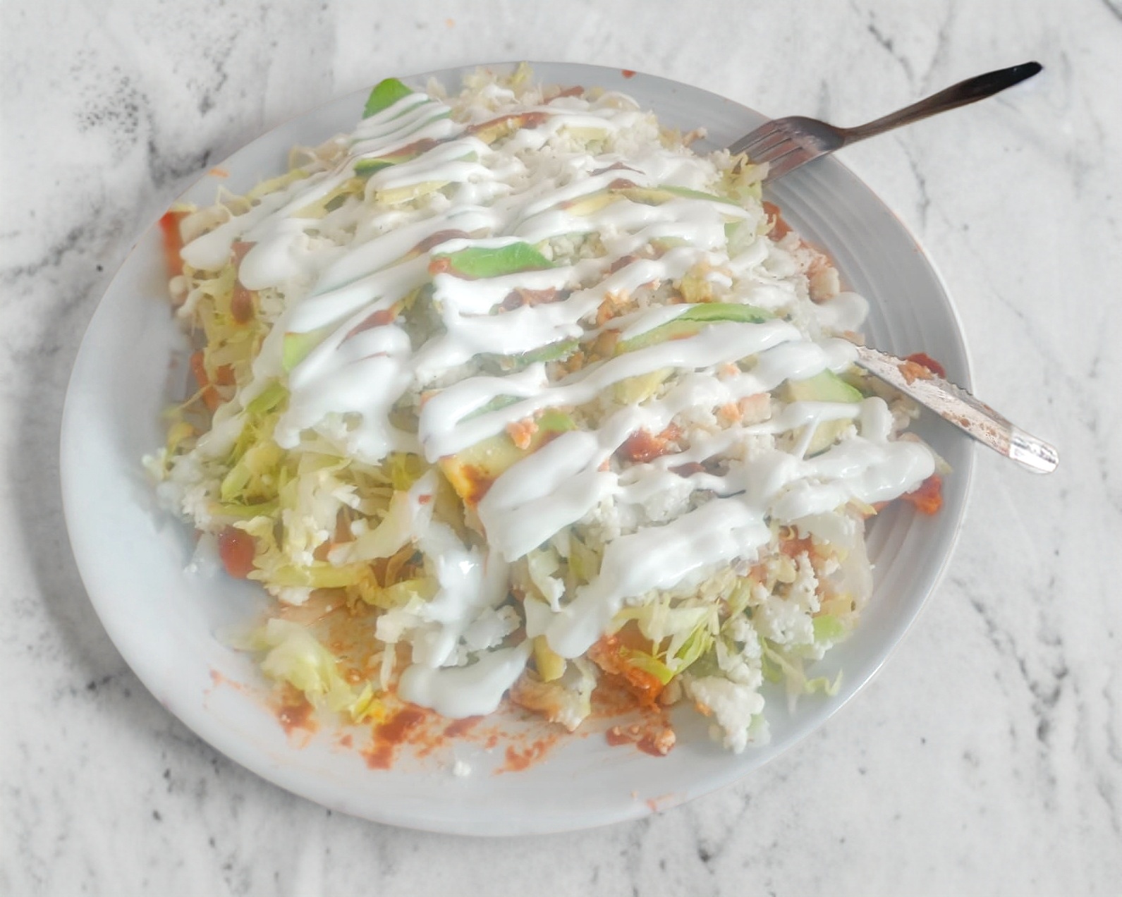 Chilaquiles (verdes o rojos), frijol, huevo, crema y queso.