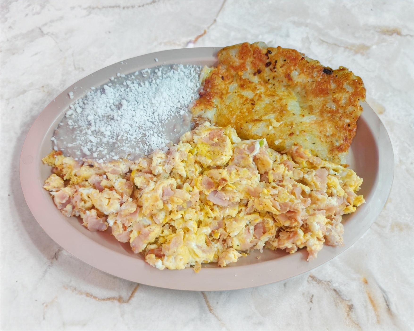 Jamón, tocino, huevo estrellado, aguacate, queso amarillo, queso Monterrey.
