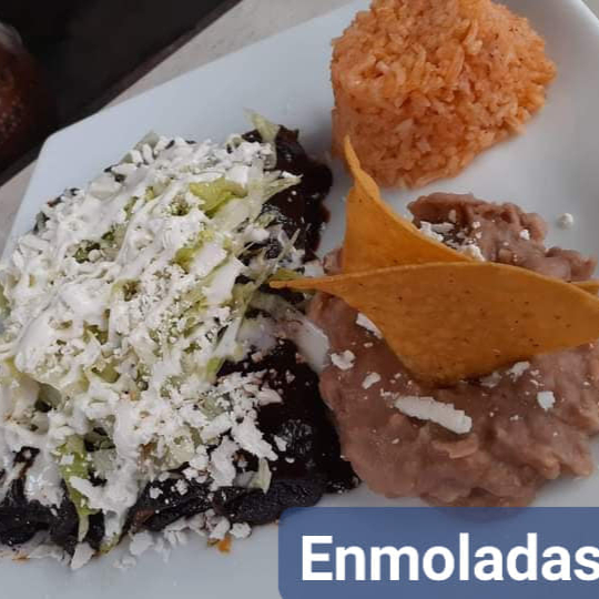 Con mole negro de la casa, lechuga, queso y crema, acompañadas de arroz y frijol(4 piezas)