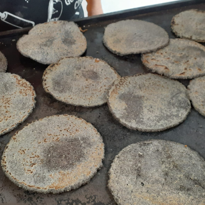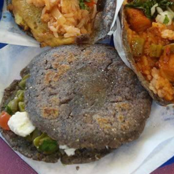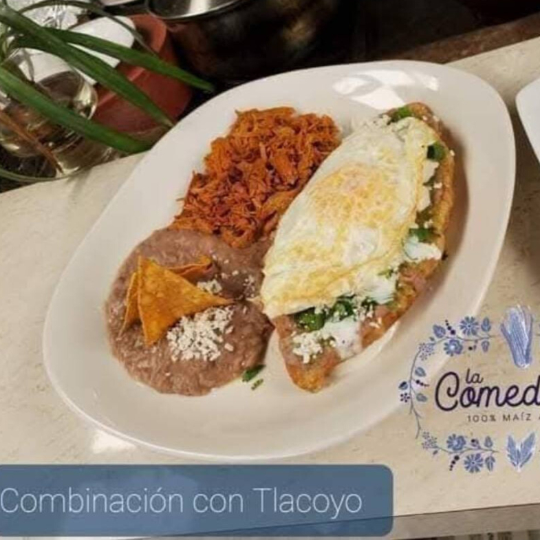 Tlacoyo a elegir con huevo montado, acompanado de machaca o cochinita y frijoles
