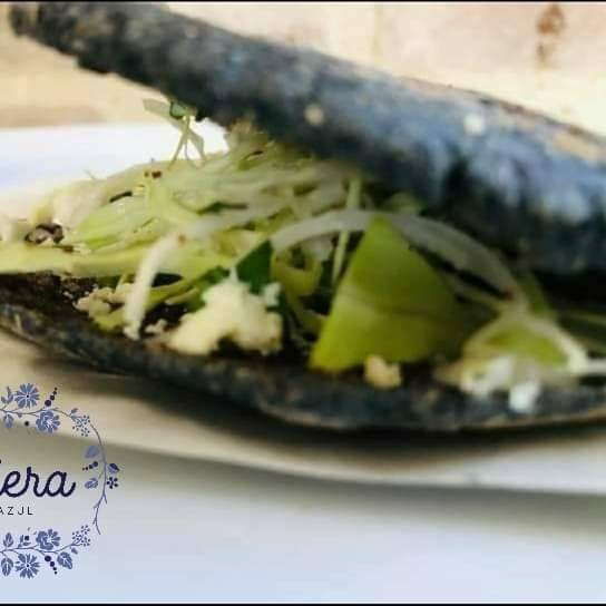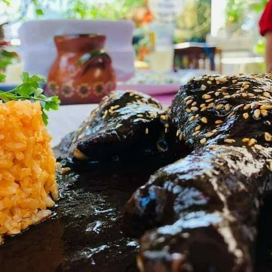 Sobre espejo de mole negro de la casa, rellena de frijol negro con queso