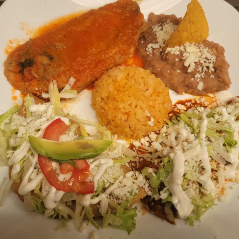 1 Chile relleno + enchilada roja y taco dorado de pollo, acompañado de arroz y frijol