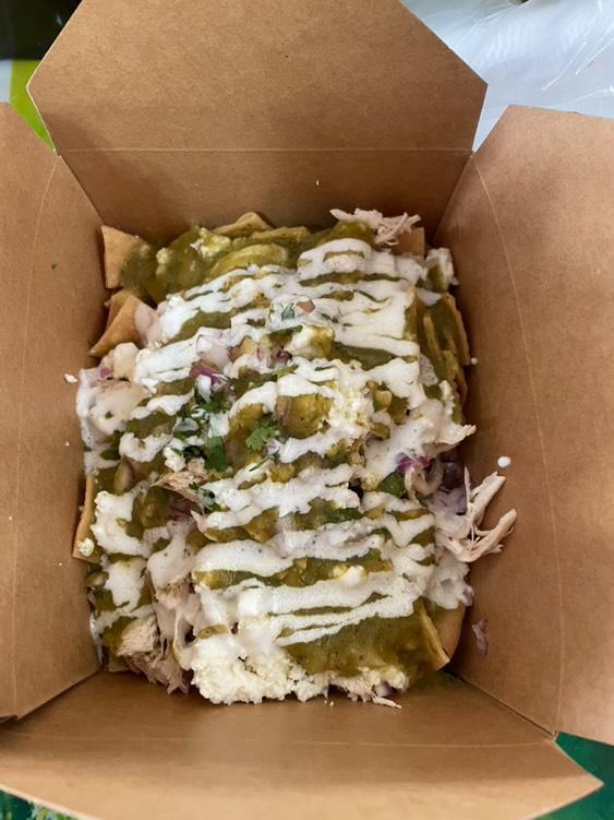 Totopos bañados en salsa roja o verde, con queso fresco y crema.