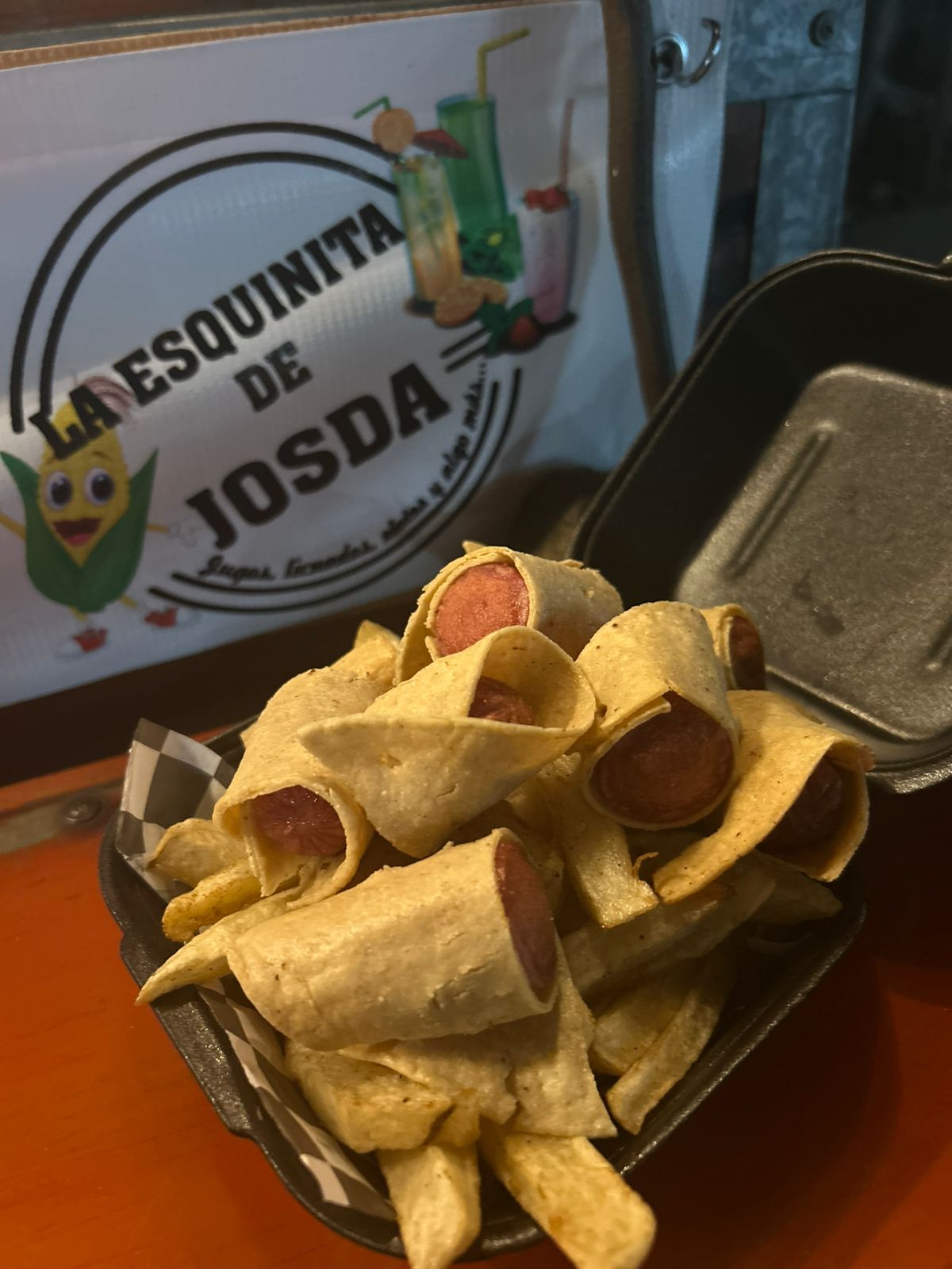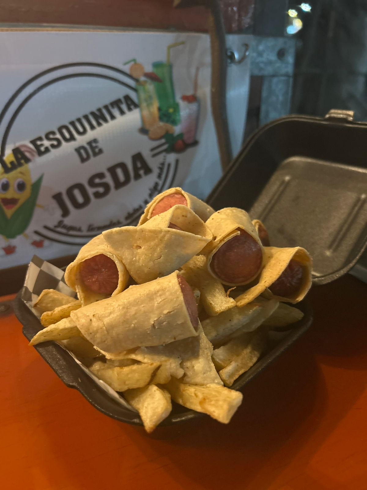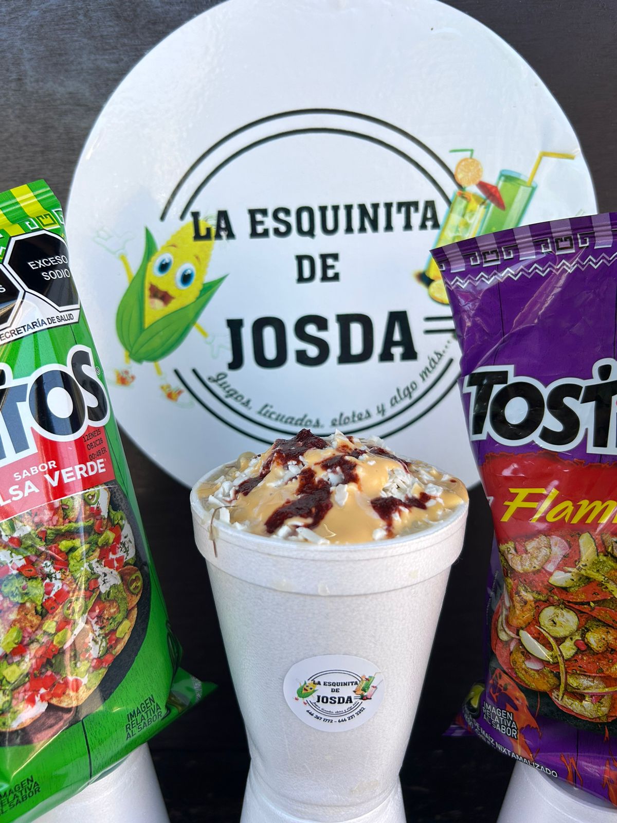 Tostitos preparados con elote, queso, mayonesa y una pizca de chile en polvo.