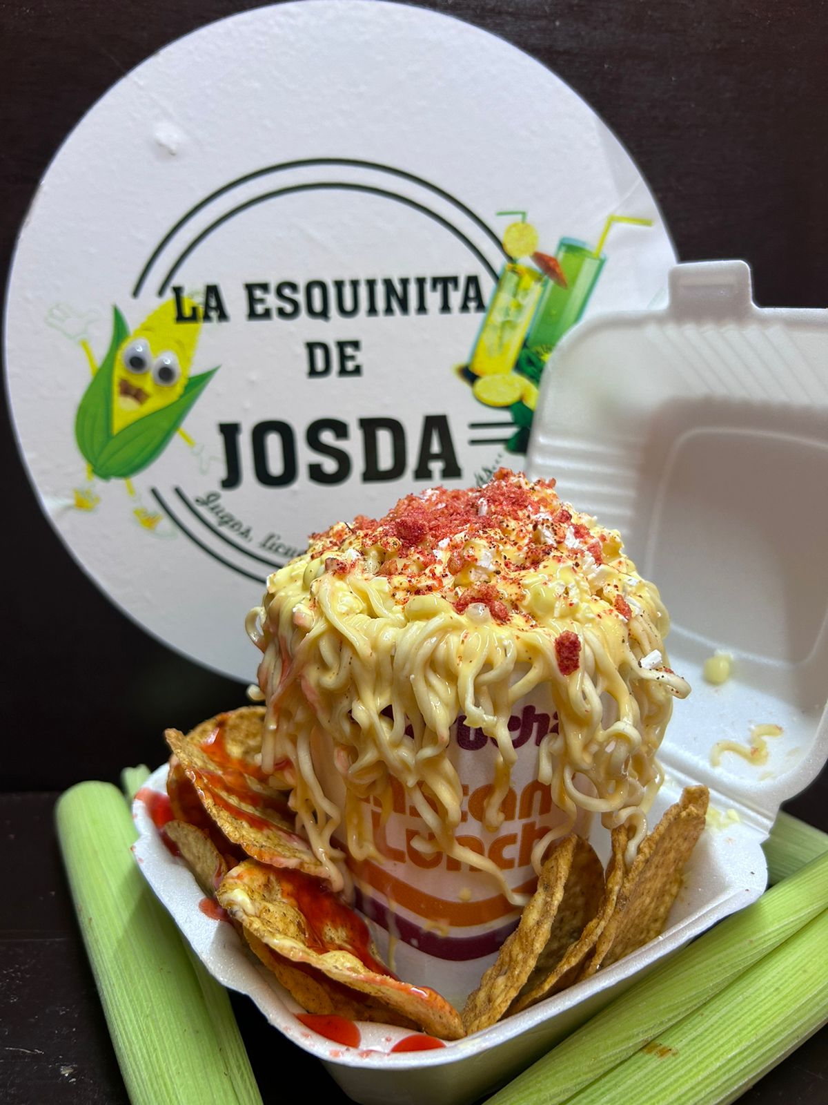 Sopa instantánea con granos de elote, queso, mayonesa y un toque de chile para realzar el sabor.