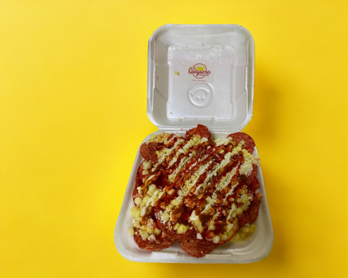 Cóctel de elote, mayonesa, , mantequilla, limón, sal, queso cotija, chamoy y chile.
