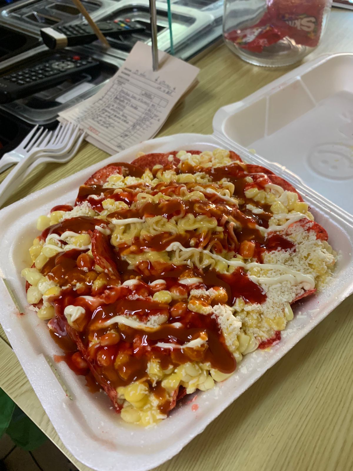 1 sopa de vaso,1 papitas (tostitos) ,cóctel de elote, mantequilla, mayonesa, limón, sal, queso cotija, queso para nachos (se manda aparte) y chamoy