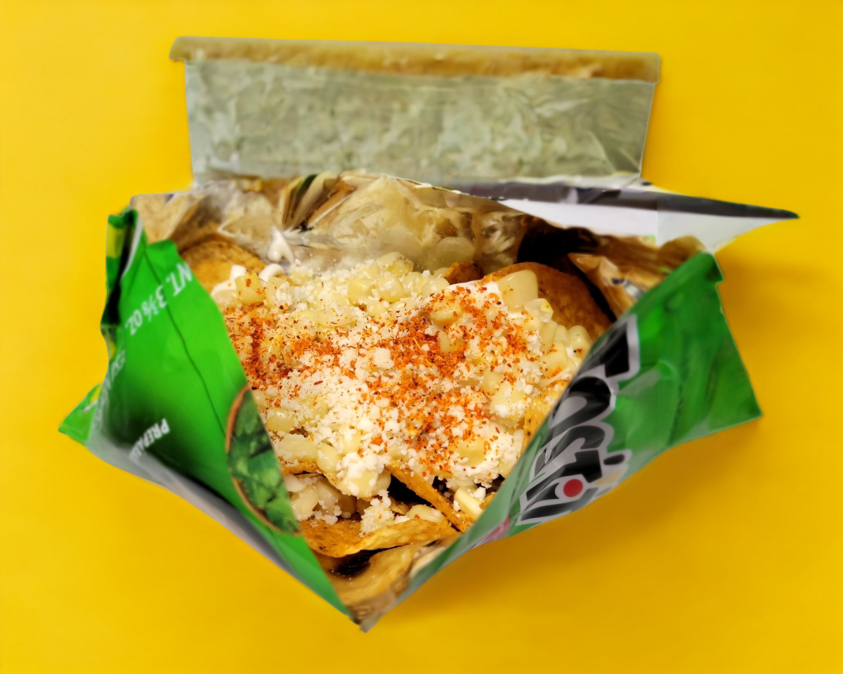 Coctel de elote, mantequilla, mayonesa, limón, sal, queso cotija, chamoy, chile y bolsa de tostitos