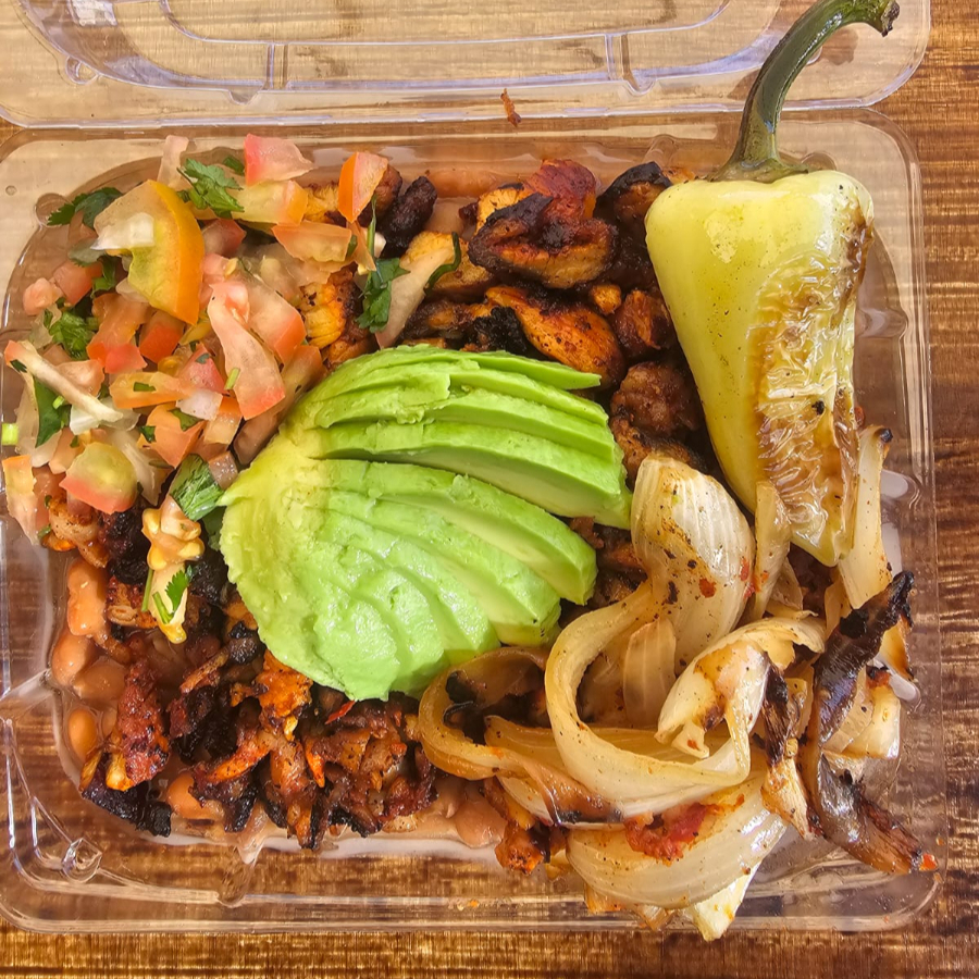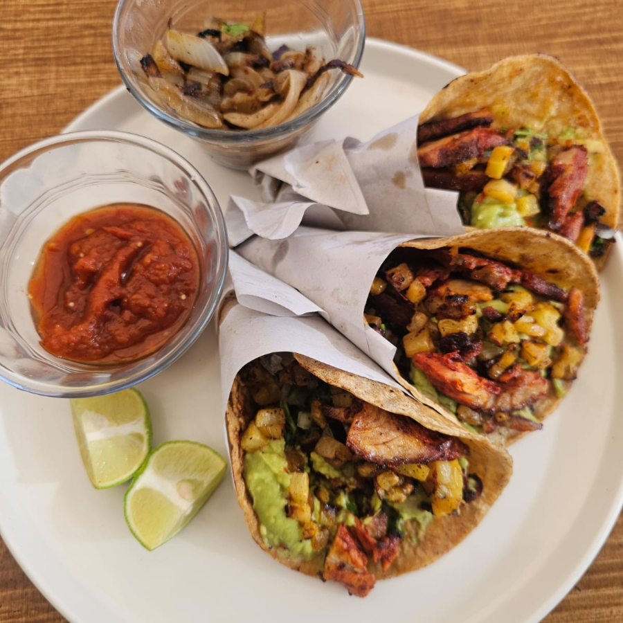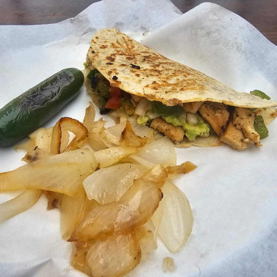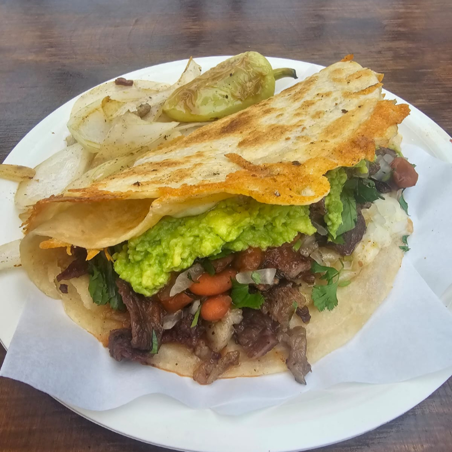 TORTILLA DE MAIZ HECHA A MANO, PECHUGA, QUESO MONTERREY, AGUACATE, CHILE MORRON, CEBOLLITA ASADA, CHILE JALAPENO