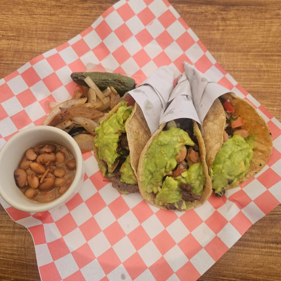FRIJORES, CARNE ADOBADA, ASADA, SALSA BANDERA, CEBOLLITA ASADA, AGUACATE, CHILE GUERO