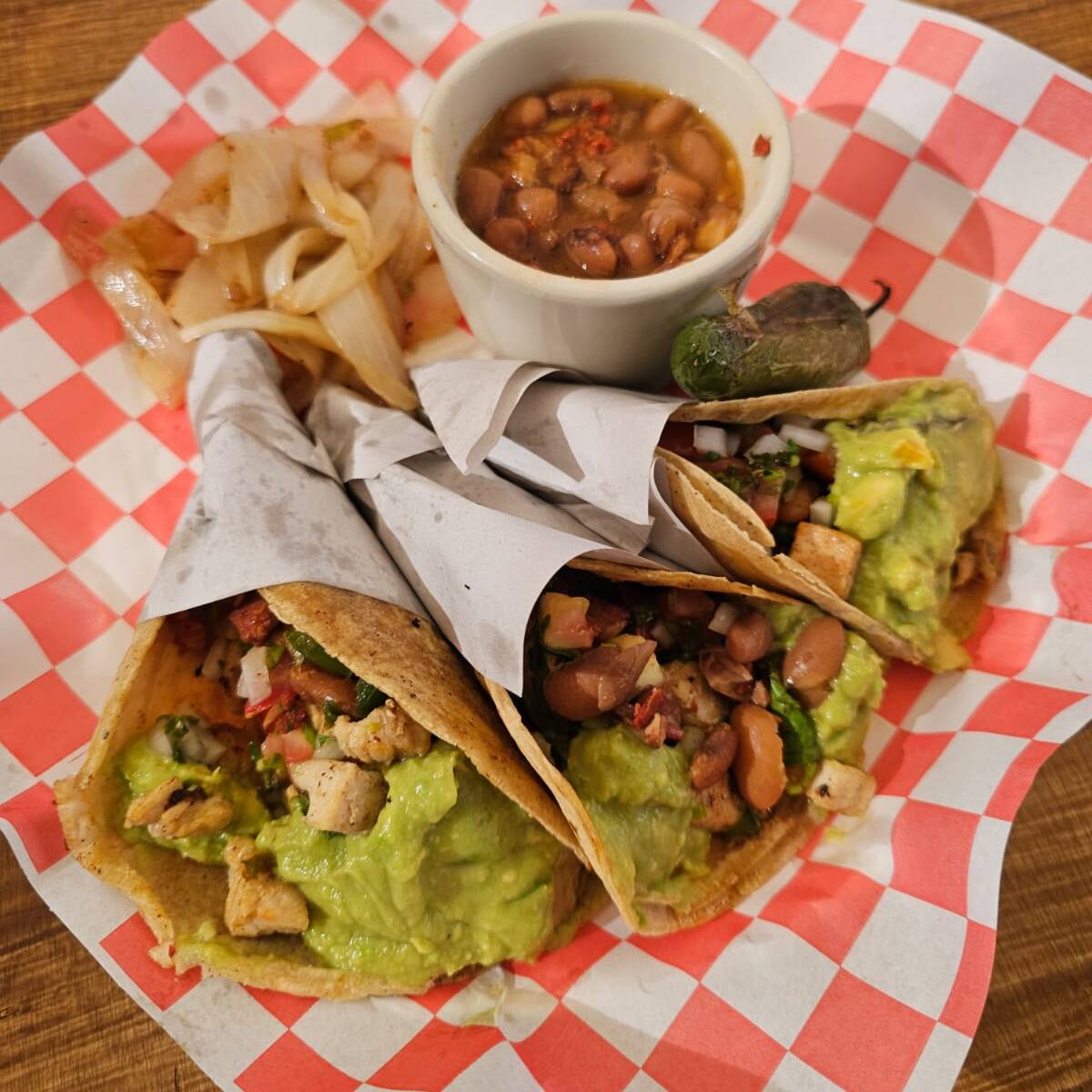 PECHUGA ALA PLANCHA, GUACAMOLE, PICO DE GALLO, FRIJOLES Y CEBOLLA CARAMERIZADA