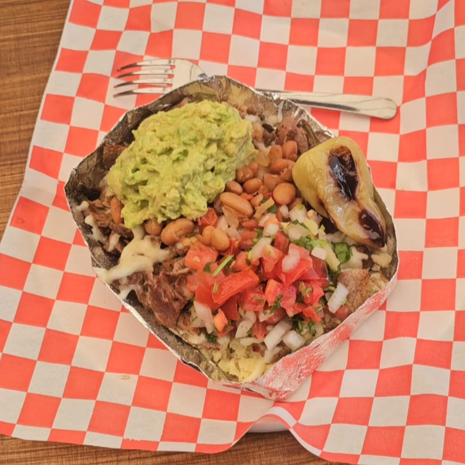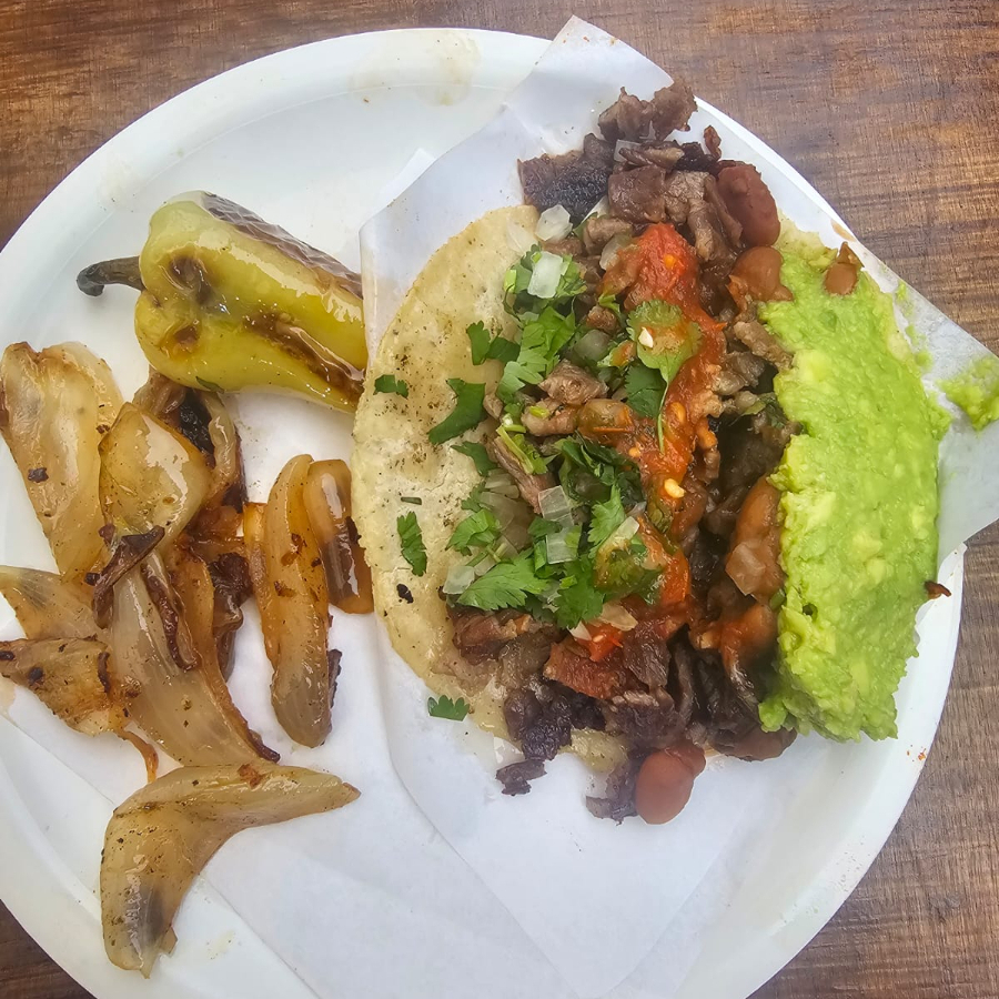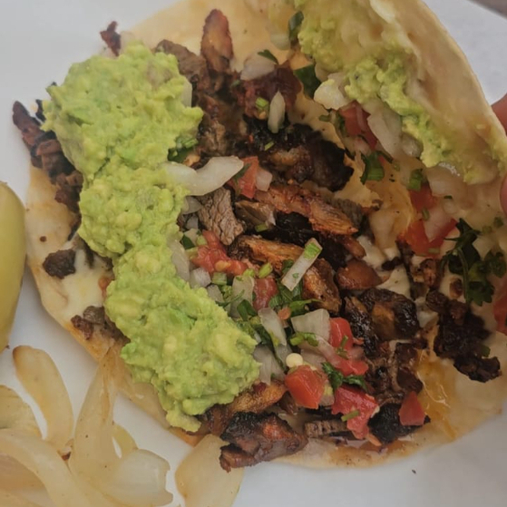 Carne asada, Carne adobada, Frijoles de la olla, guacamole ,queso amarillo, cilantro , cebolla y salsa.
