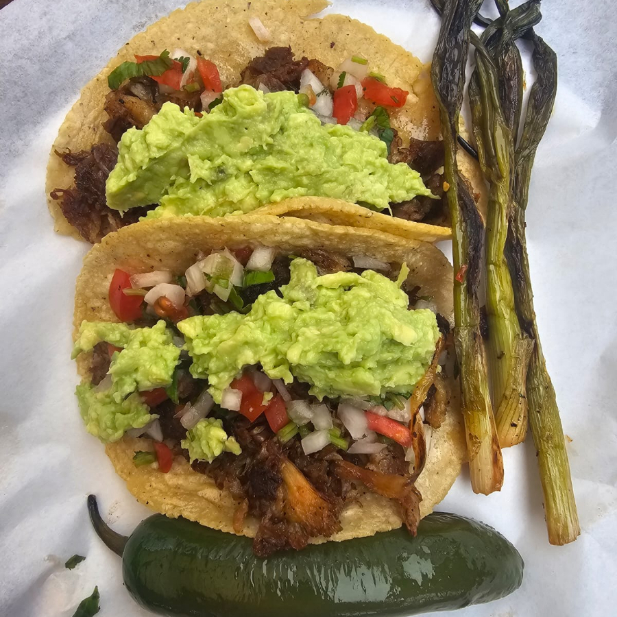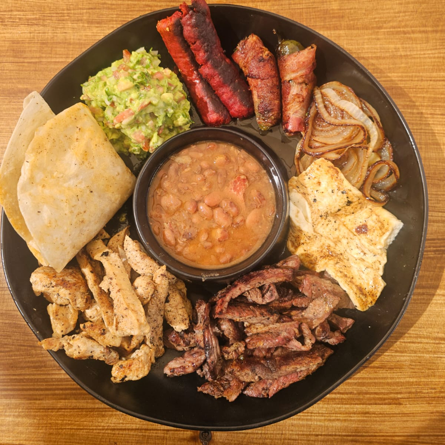 Carne asada, carne adobada, chorizo, quesadillas, papas fritas, guacamole, frijoles de la olla, chile guero, cebollines asados