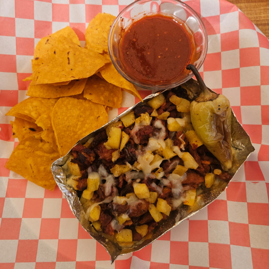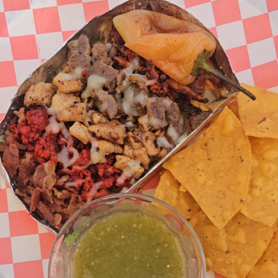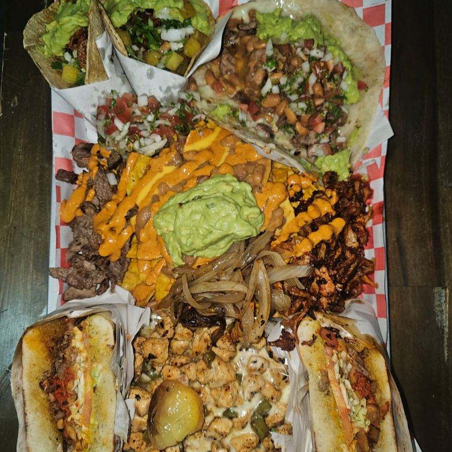 2 TACOS DE ADOBADA,QUESATACO DE ASADA TORTILLA DE HARINA, NACHOS CON CARNE ASADA Y ADOBADA, TORTA MIXTA, PAPA RELLENA PECHUGON, GUACAMOLE, PICO DE GALLO, CEBOLLA CARAMELIZADA Y CHILE GUERO