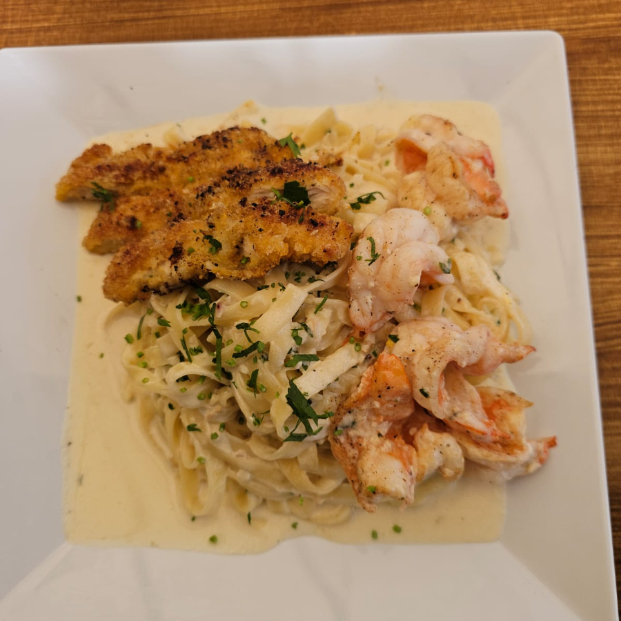 PASTA EL SALSA ALFREDO, PECHUGA EMPANIZADA, CAMARON