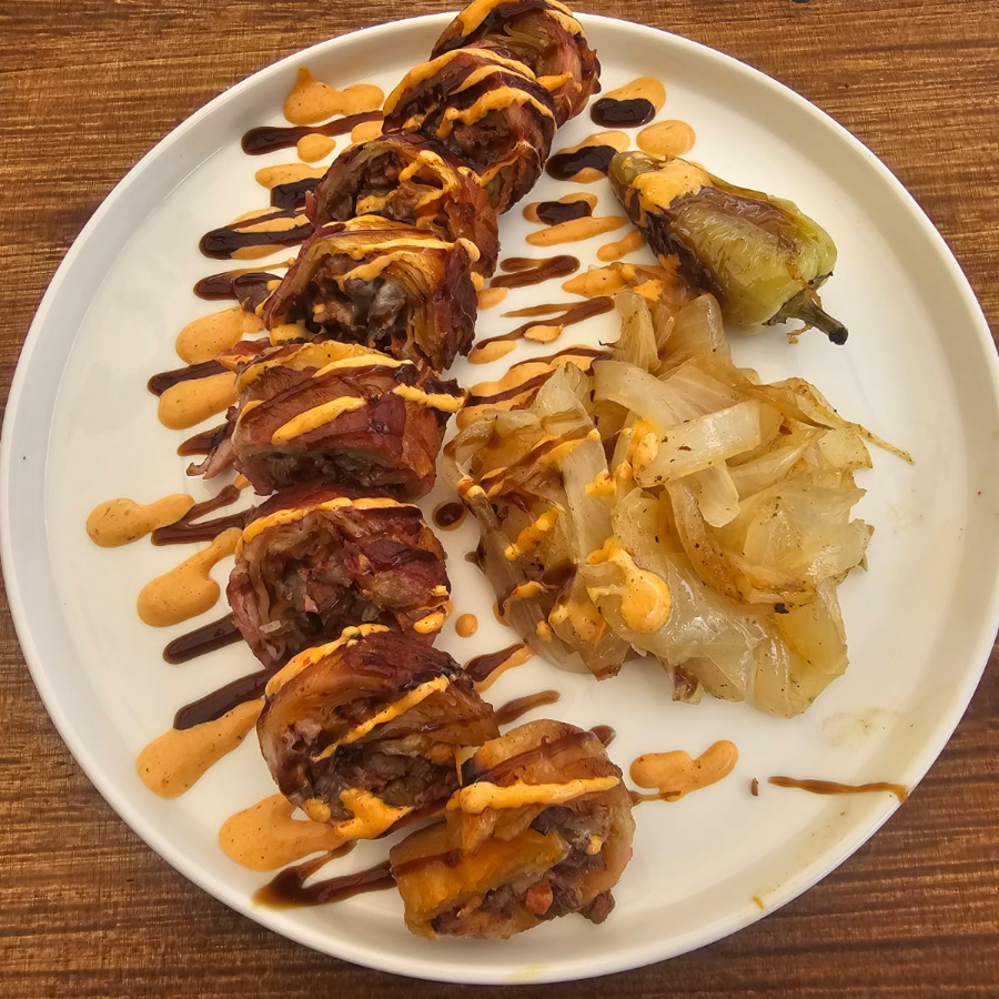 CARNE ADOBADA.ASADA, QUESO MONTERREY, CEBOLLA ASADA, TOCINO,ADEREZO CHIPOTLE