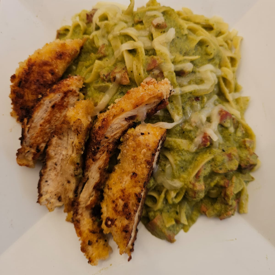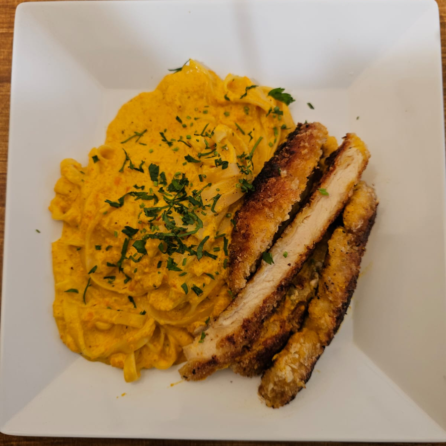 PASTA EN SALSA DE PIMIENTOS, PECHUGA EMPANIZADA