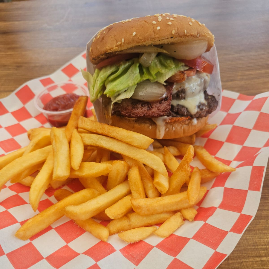 Pan hamburguesa, doble carne 100% de res, queso monterrey, tomate, lechuga, cebolla caramelizada, mayonesa, ketchup, aderezo chipotle, acompanada de papas fritas