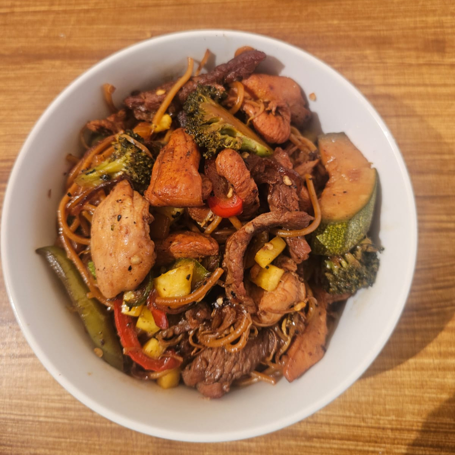 Noddles de huevo, pechuga, carne de res, chop suey, pimientos, calabaza, brocoli, pina, serrano, salsa teriyaki de la casa