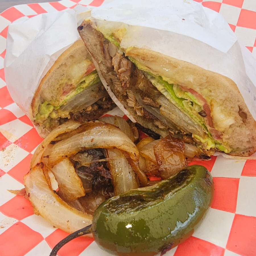 CARNE ASADA , QUESO MONTERREY, CEBOLLA, CILANTRO , AGUACATE Y MAYONESA.