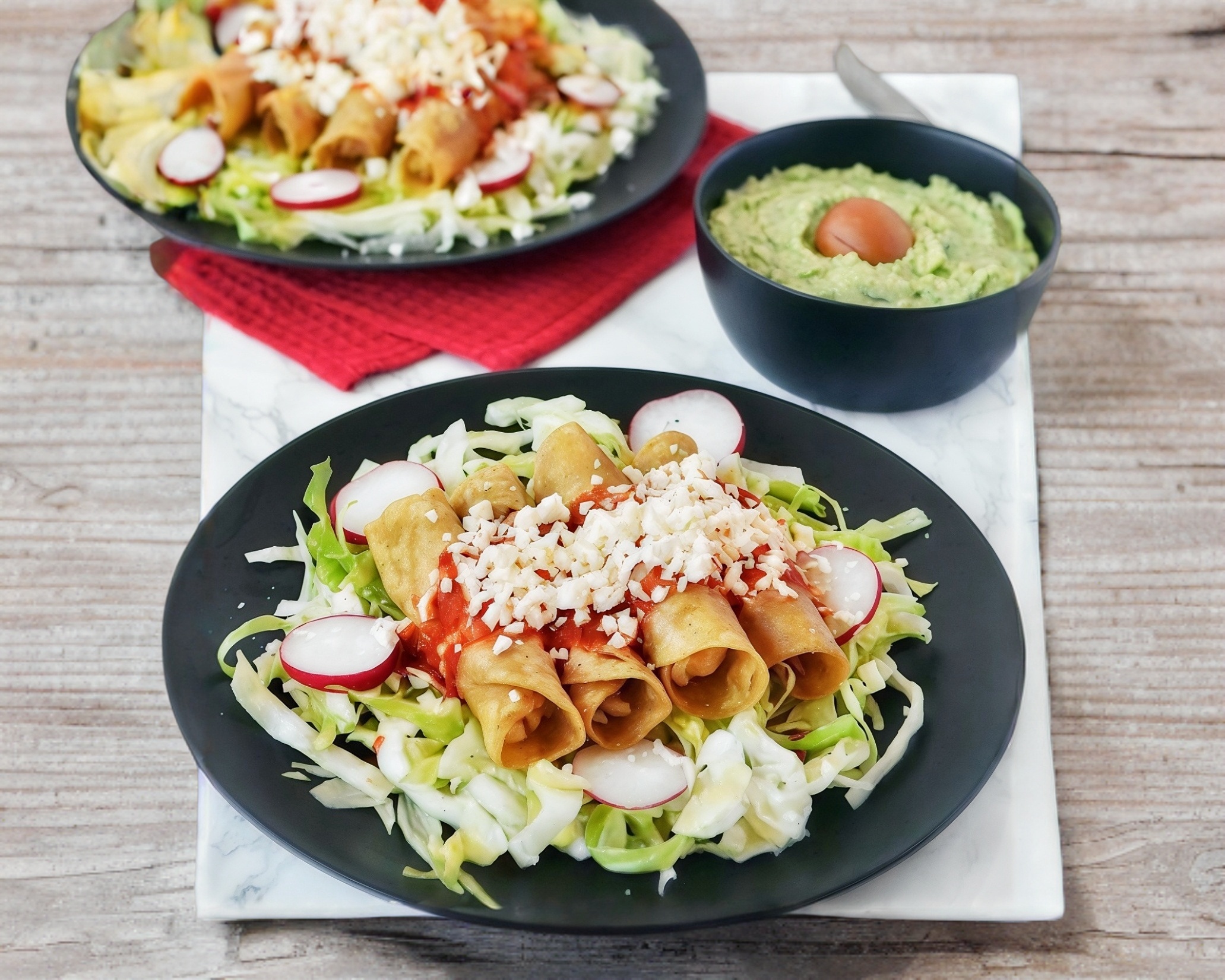 Deliciosas Flautas De Carne De pozole , Servidas Con Crema , Queso Cotija , Lechuga Fresca , Rábano , Bañadas En Una salsa Casera De tomate Estilo Morocha ( No pica es un caldillo de tomate ) Te mandamos Salsa Macha Estilo Morocha