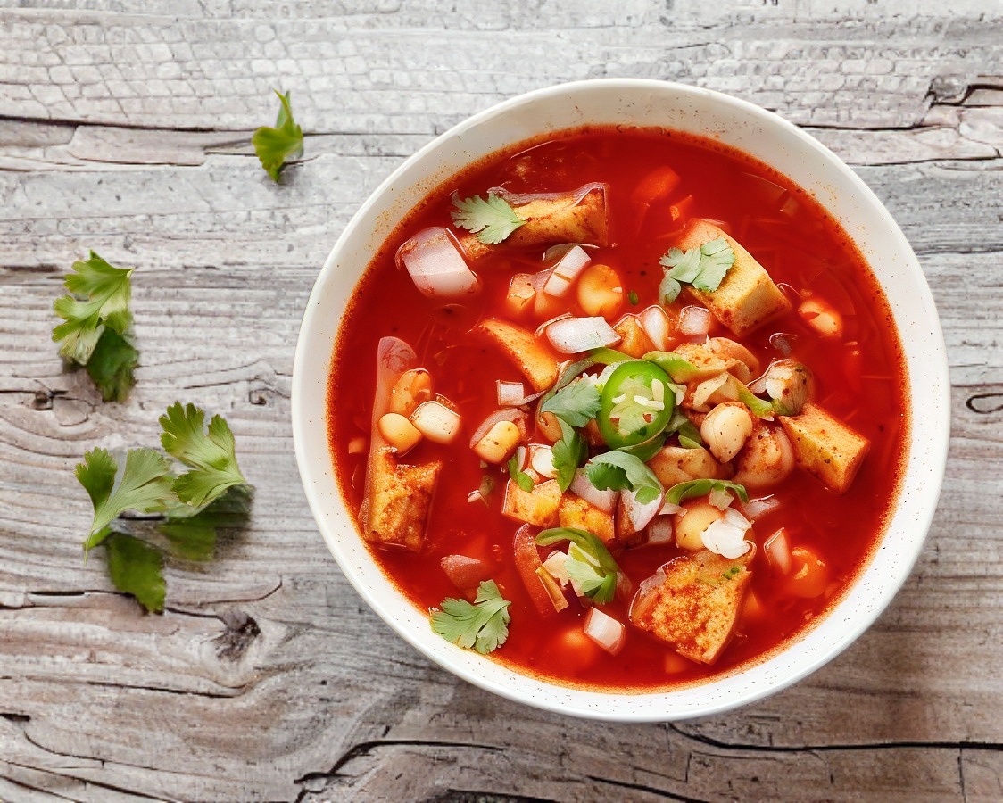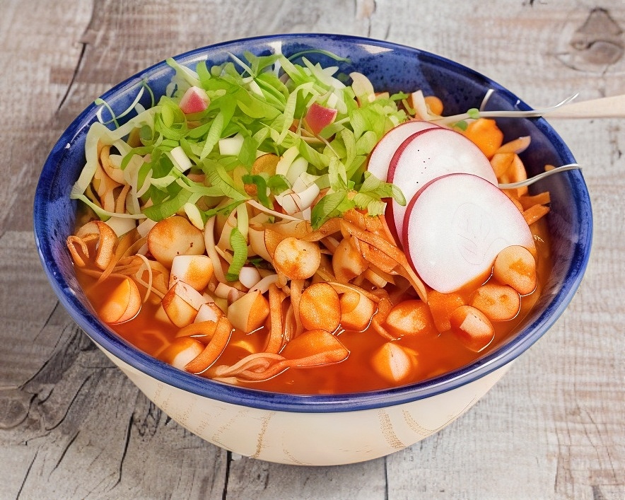 1/2 Orden Del Tradicional Pozole Mexicano Servido Con Carne y Grano Te Mandamos Lechuga Fresca , Cebolla , Rábano , Limones , Salsa Macha Estilo Morocha y Salsa Verde Artesanal Con Los Ya Tradicionales Totopos