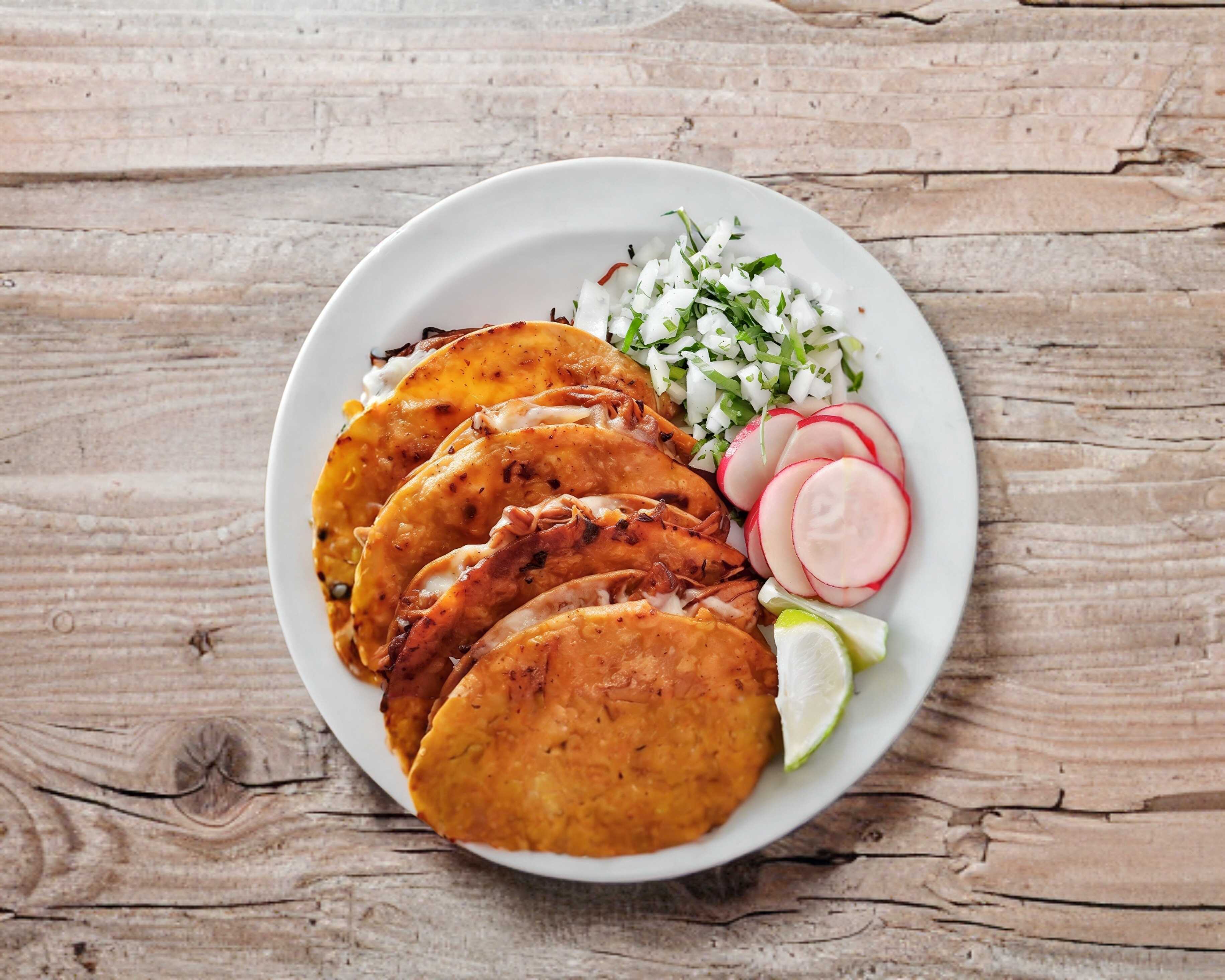 Deliciosos Tacos 🌮 Dorados De Carne de Pozole ( Puerco ) Preparados Con Queso Gratinado y El Taco ala Plancha, Te Mandamos , Lechuga Fresca, Cilantro, Cebolla, Limónes , Rábano , Salsa Macha Estilo Morocha