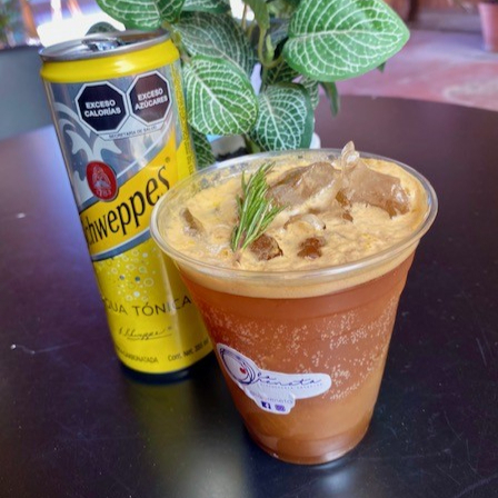 Bbida refrescante de café intenso, agua tónica, jugo de naranja y jarabe de romero.