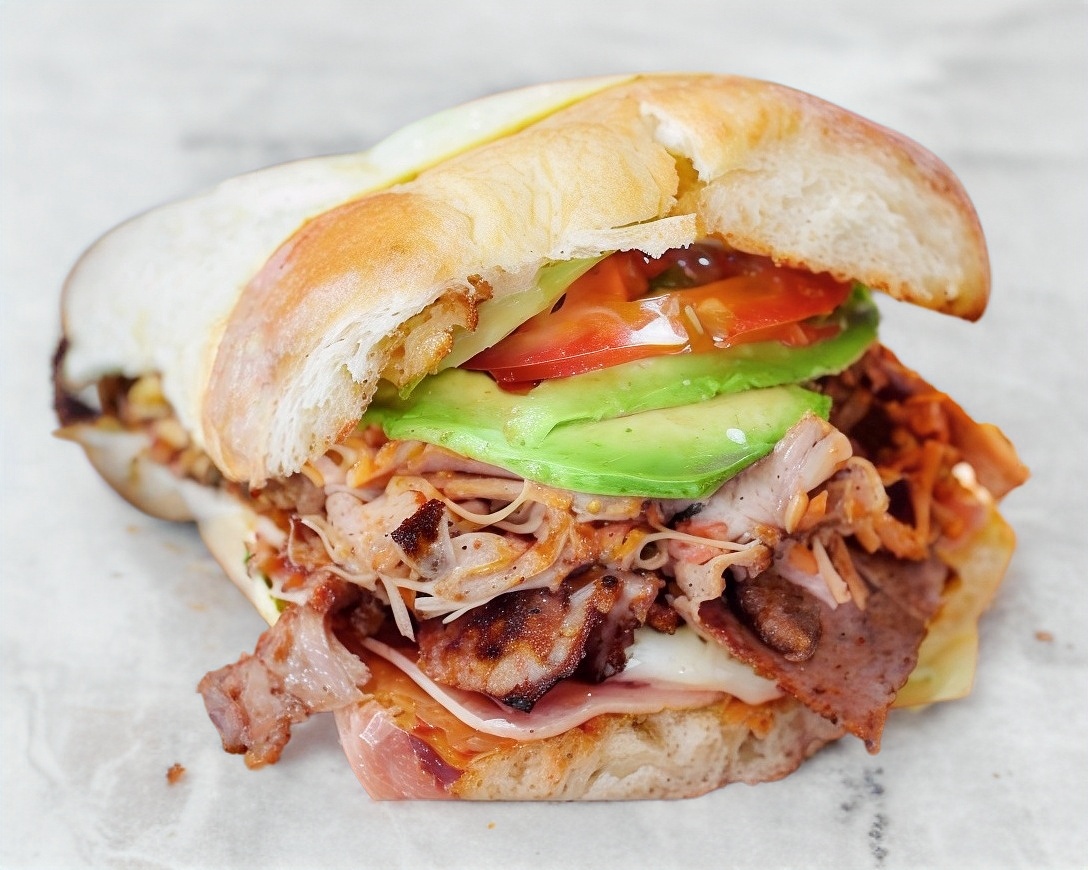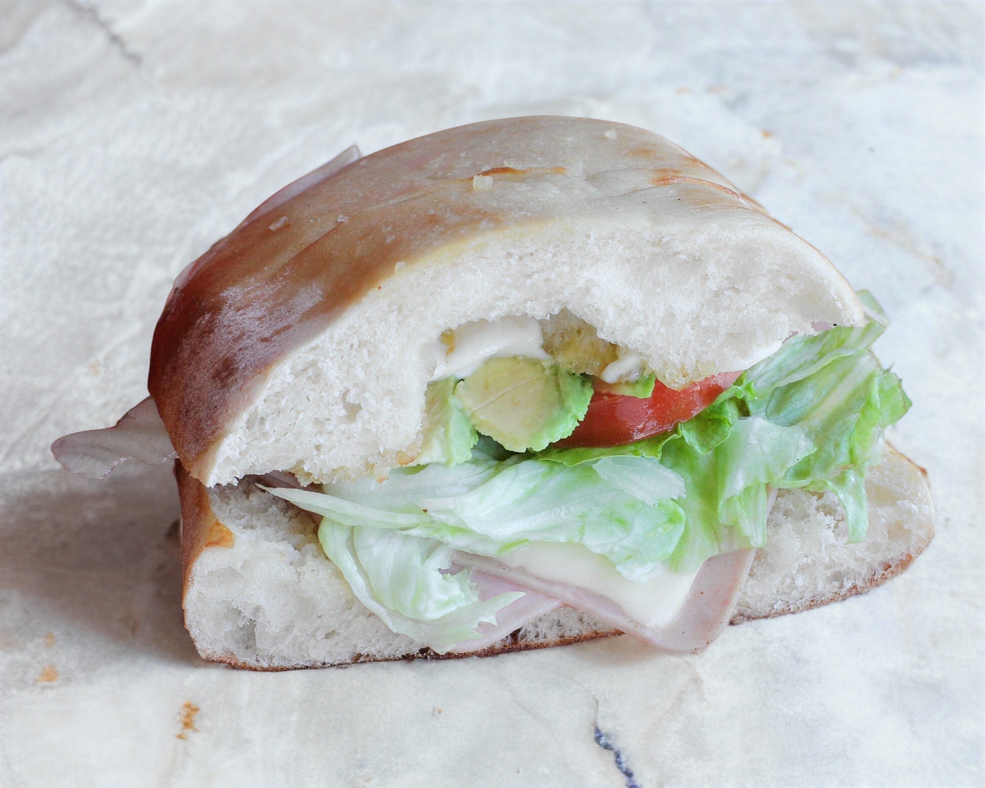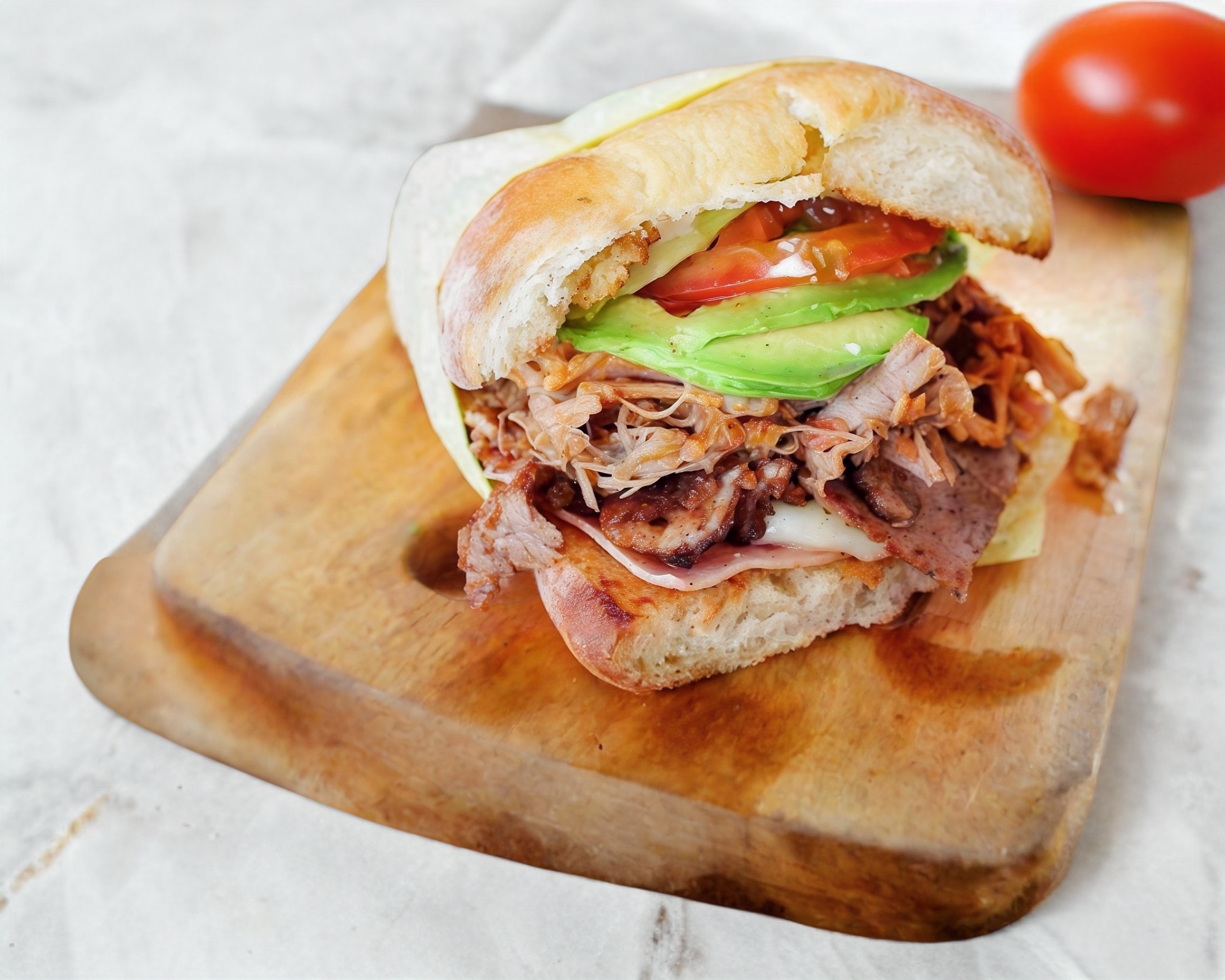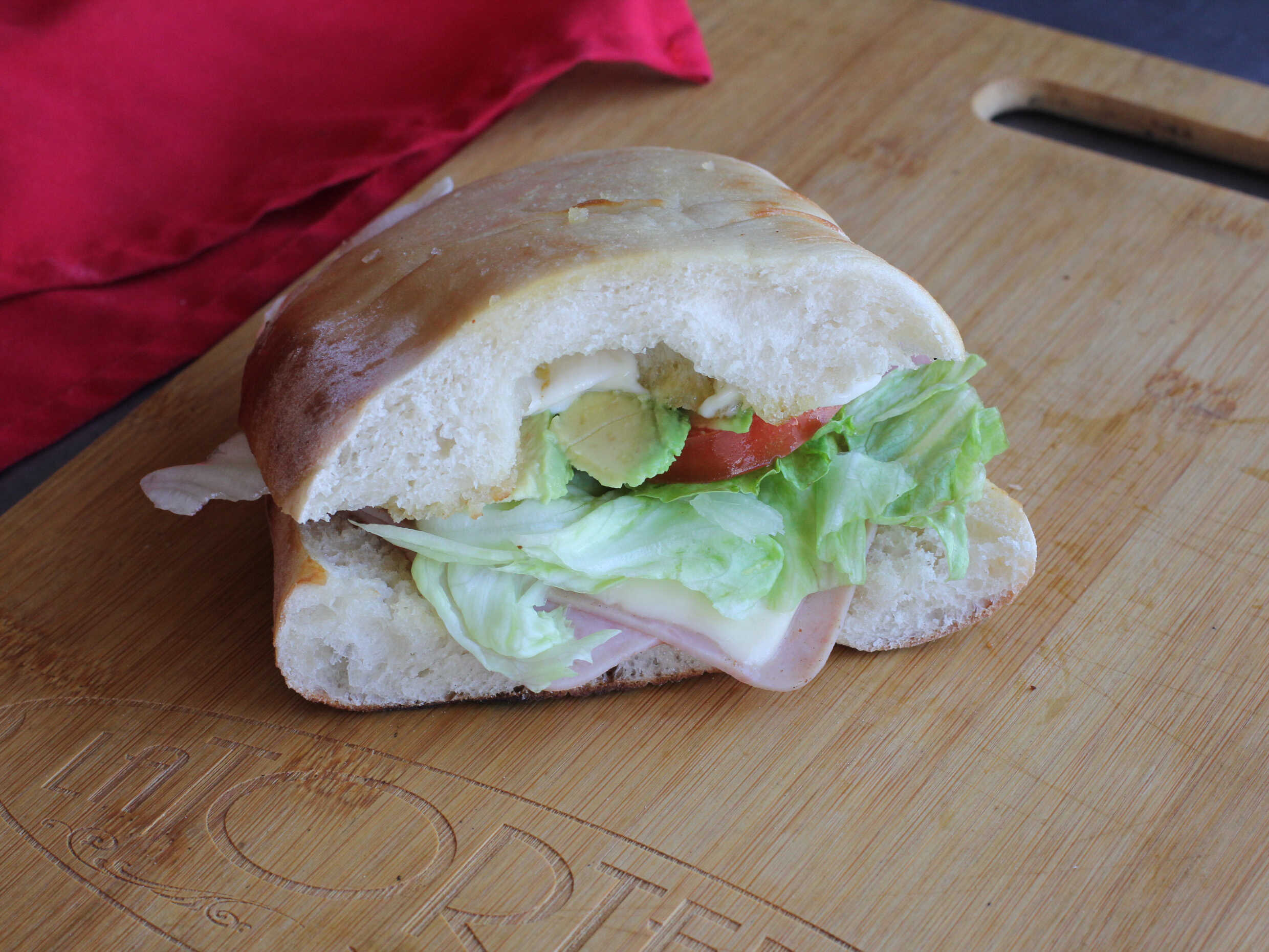Torta de jamón, queso, lechuga, tomate y aguacate