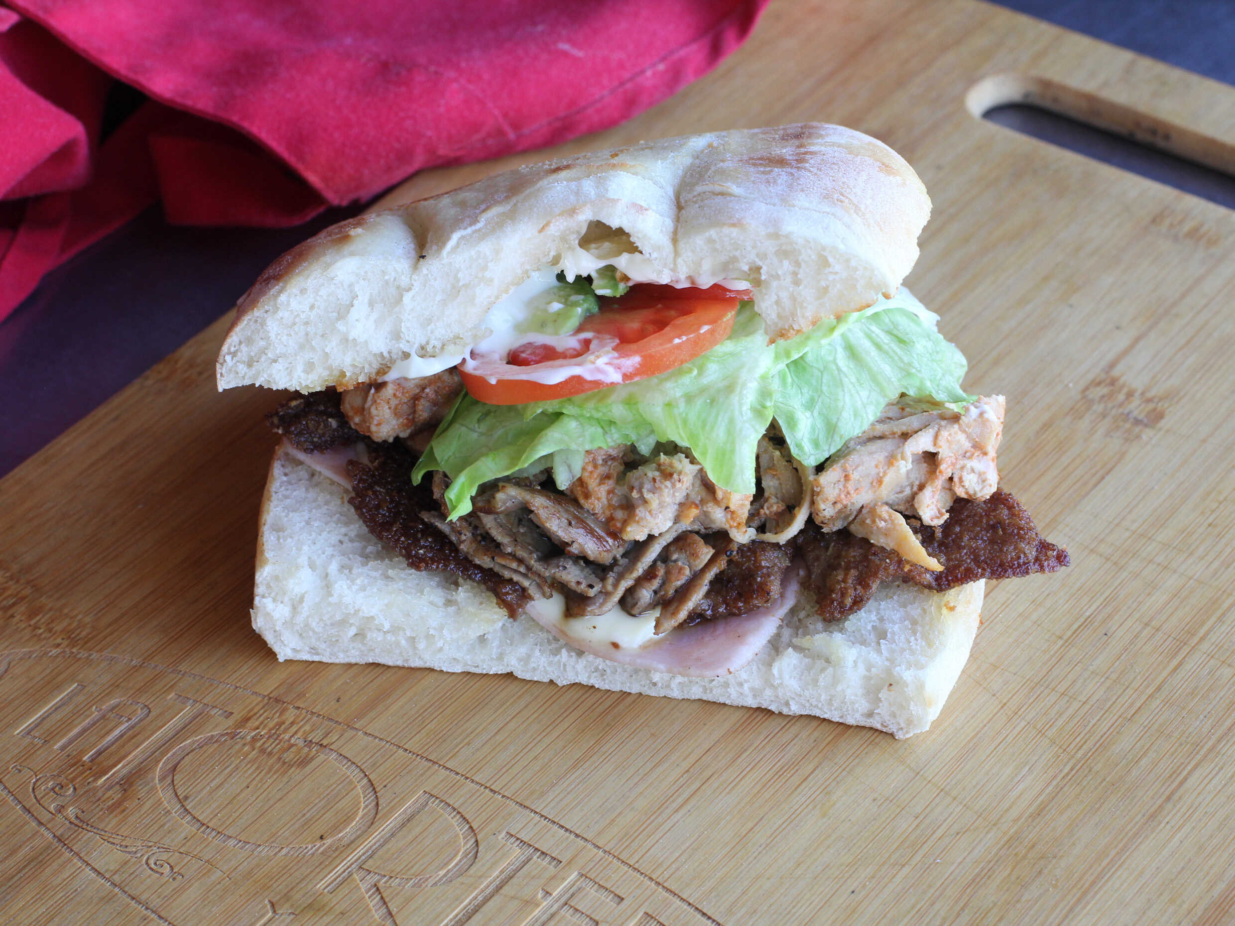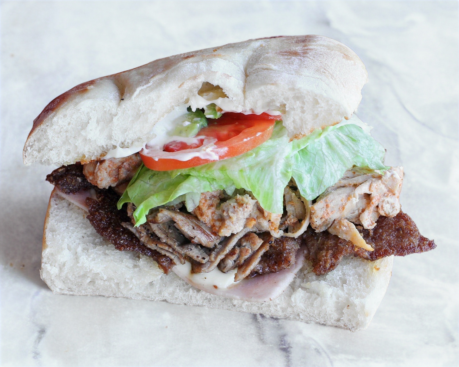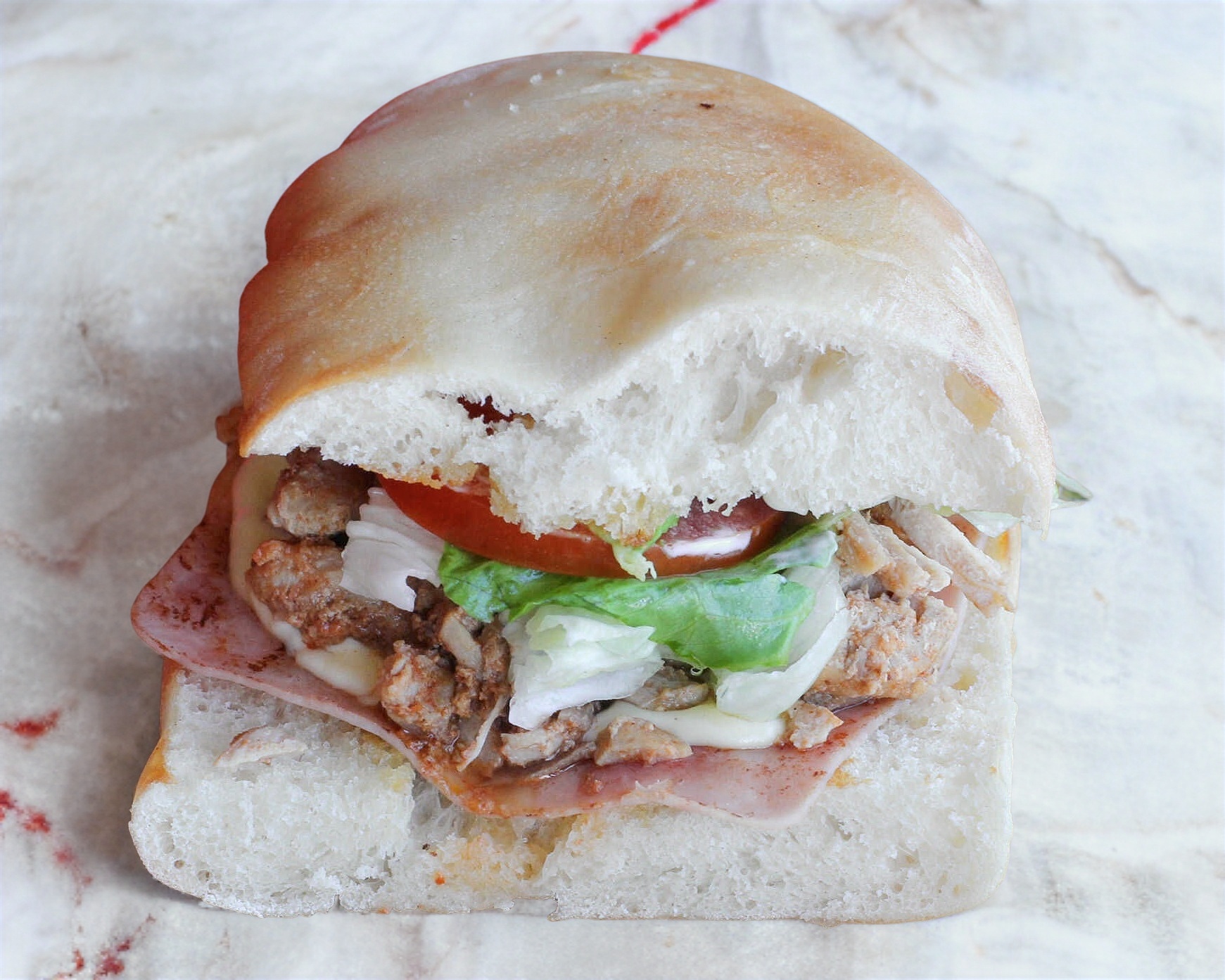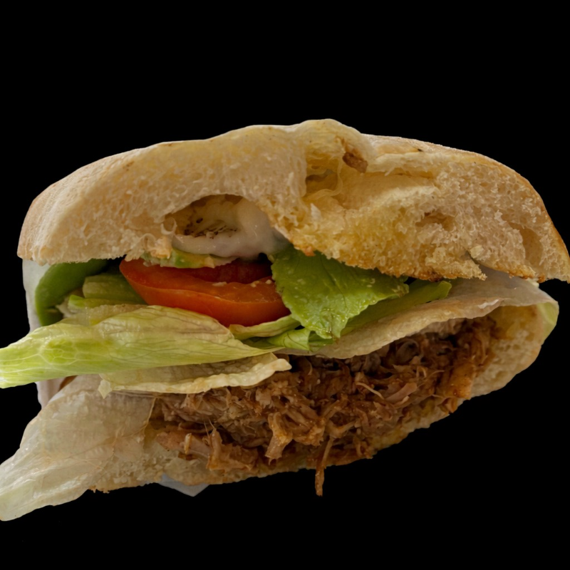 Torta de jamón, queso, lechuga, tomate y aguacate