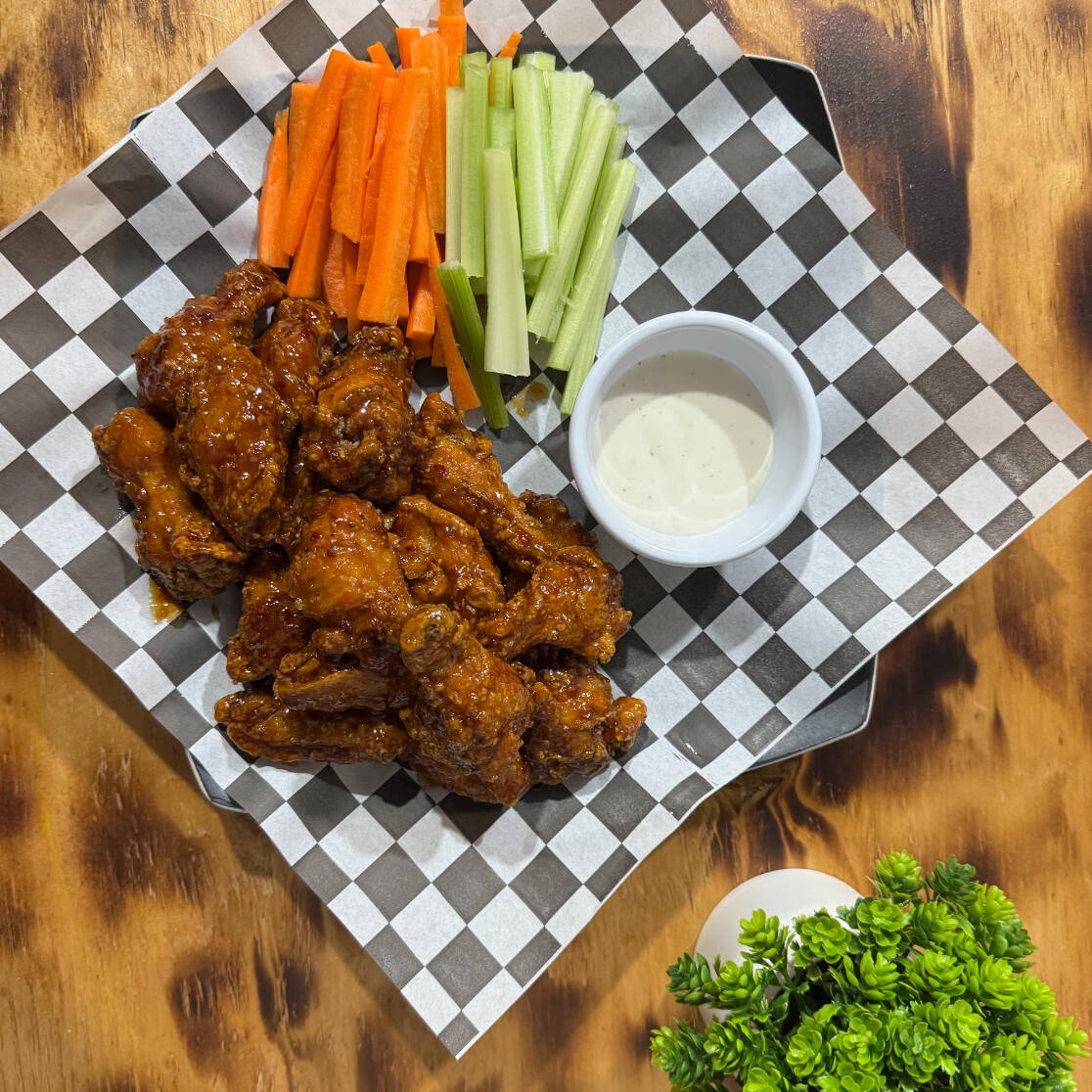 Orden de 8 alitas, crujientes por fuera y jugosas por dentro, preparadas al momento y bañadas con la salsa de tu preferencia. Incluye apios, zanahorias y ranch.