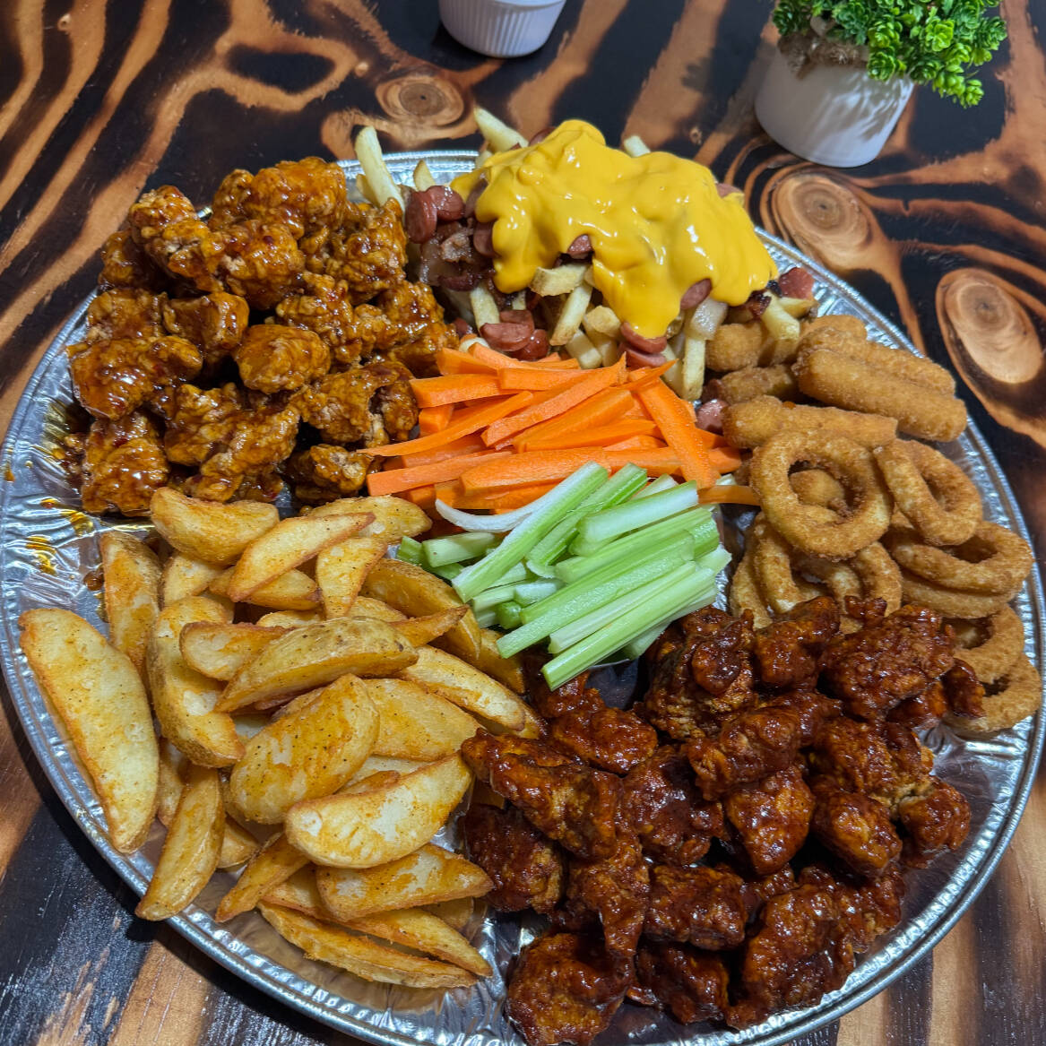 Charola para compartir (sugerencia 3 o 4 personas) con papas sazonadas, 2 órdenes a elegir de boneless, alitas o combinado, salchipapas, dedos de queso y aros de cebolla. Incluye apio, zanahoria y aderezo ranch.