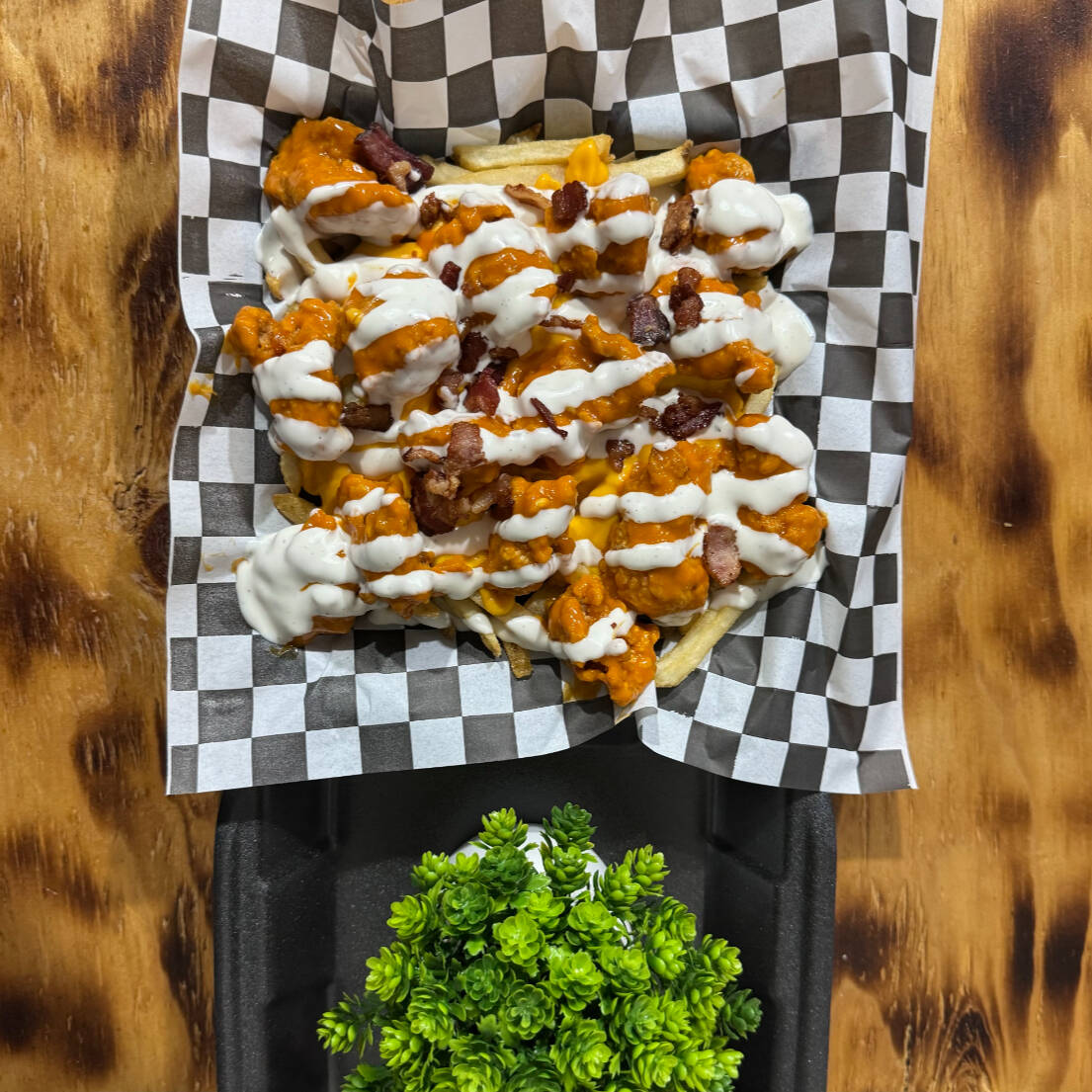 Cama de papas fritas doraditas, cubiertas con queso amarillo, coronadas con boneless crujientes bañados con la salsa de tu elección y un toque final de aderezo ranch.