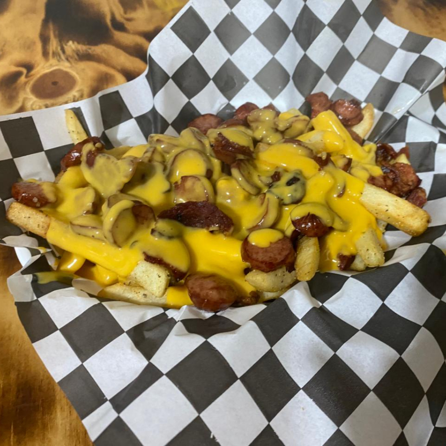 Deliciosa cama de papas a la francesa coronadas con salchicha y tocino cubiertas de queso amarillo