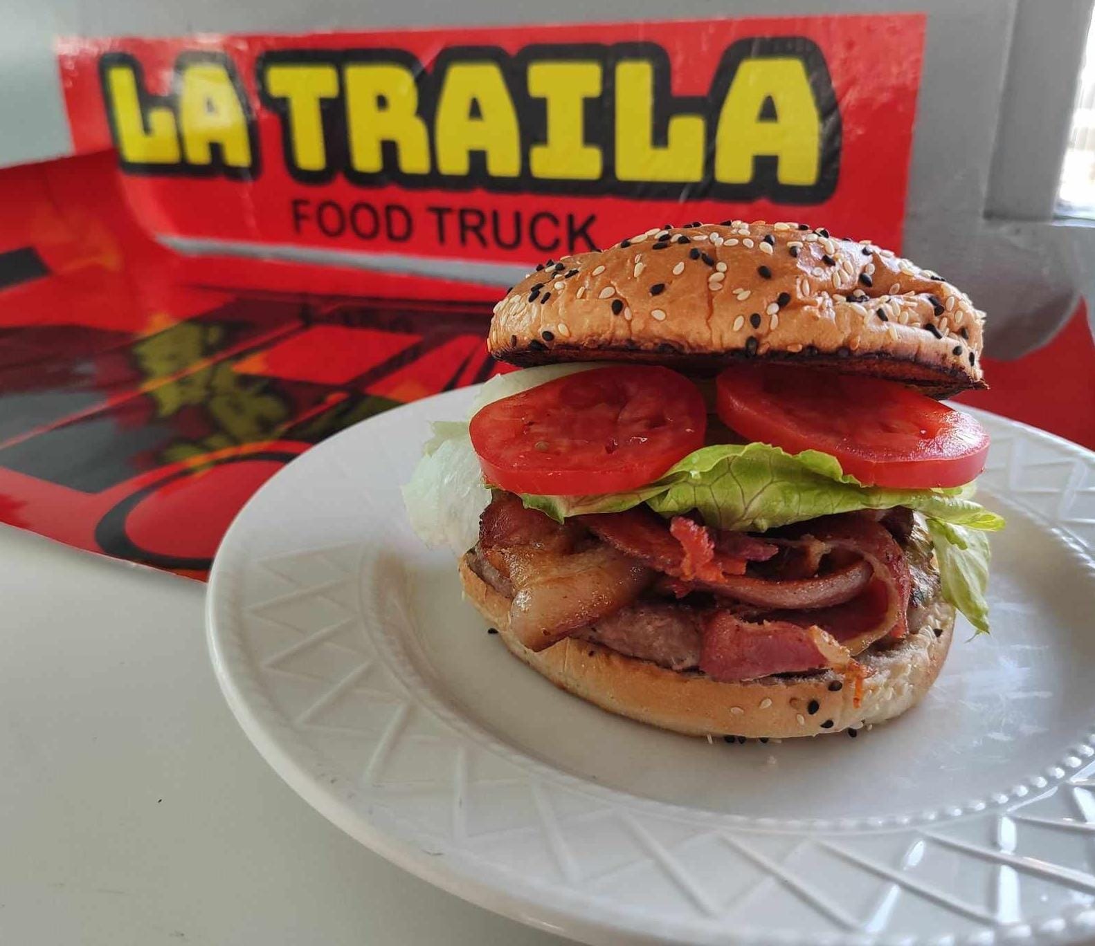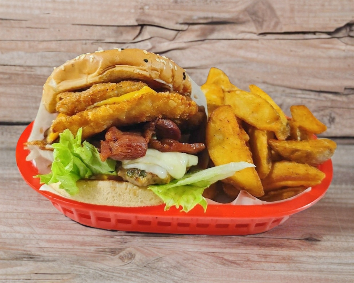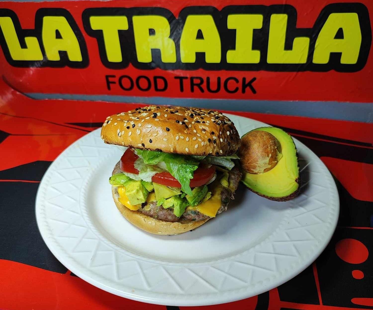 Trailera con por carne casera y pollo empanizado, aros de cebolla, tocino, queso blanco y amarillo mayonesa, mostaza catsup, tomate, lechuga en salsa de su preferencia.