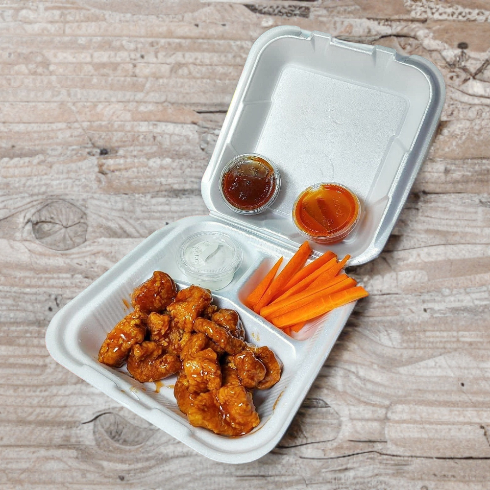 Cama de papas gajo sazonadas, baladas en queso con boneless en salsa de su preferencia y ranch.